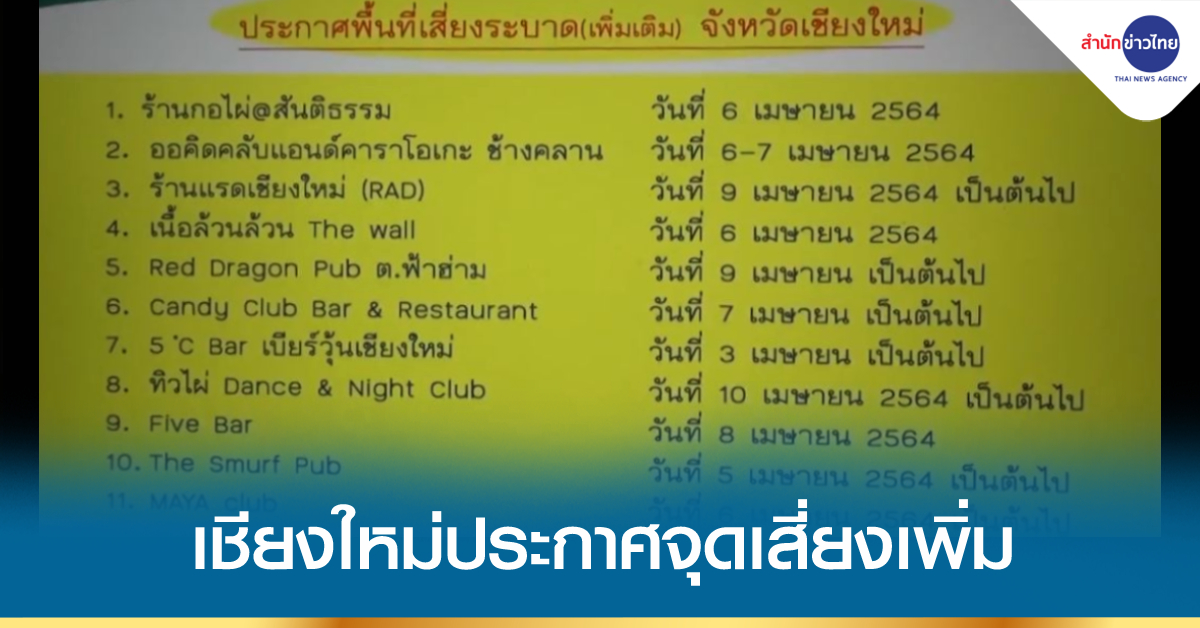 สำนักงานสาธารณสุขจังหวัดเชียงใหม่ ประกาศจุดเสี่ยงเพิ่มอีก 11 แห่ง มีทั้งร้านอาหาร สถานบันเทิง และร้านคาราโอเกะ ตามที่ปรากฏในไทม์ไลน์ผู้ป่วยโควิด-19 ประกอบด้วย ร้านกอไผ่ @สันติธรรม, ร้านออร์คิดคลับ แอนด์ คาราโอเกะ ย่าน ถ.ช้างคลาน, ร้านแรดเชียงใหม่, ร้านเนื้อล้วนล้วน The wall, Red Dragon Pub ต.ฟ้าฮ่าม, ร้าน Candy Club Bar & Restaurant, ร้าน 5°C Bar เบียร์วุ้นเชียงใหม่, ร้านทิวไผ่ Dance & Night Club, ร้าน Five Bar, ร้าน The Smurf Pub และร้าน MAYA Club ขอให้ผู้ที่ไปสถานที่ดังกล่าว ระหว่างวันที่ 3-10 เมษายน 2564 ไปตรวจหาเชื้อโควิด-19 โดยด่วน