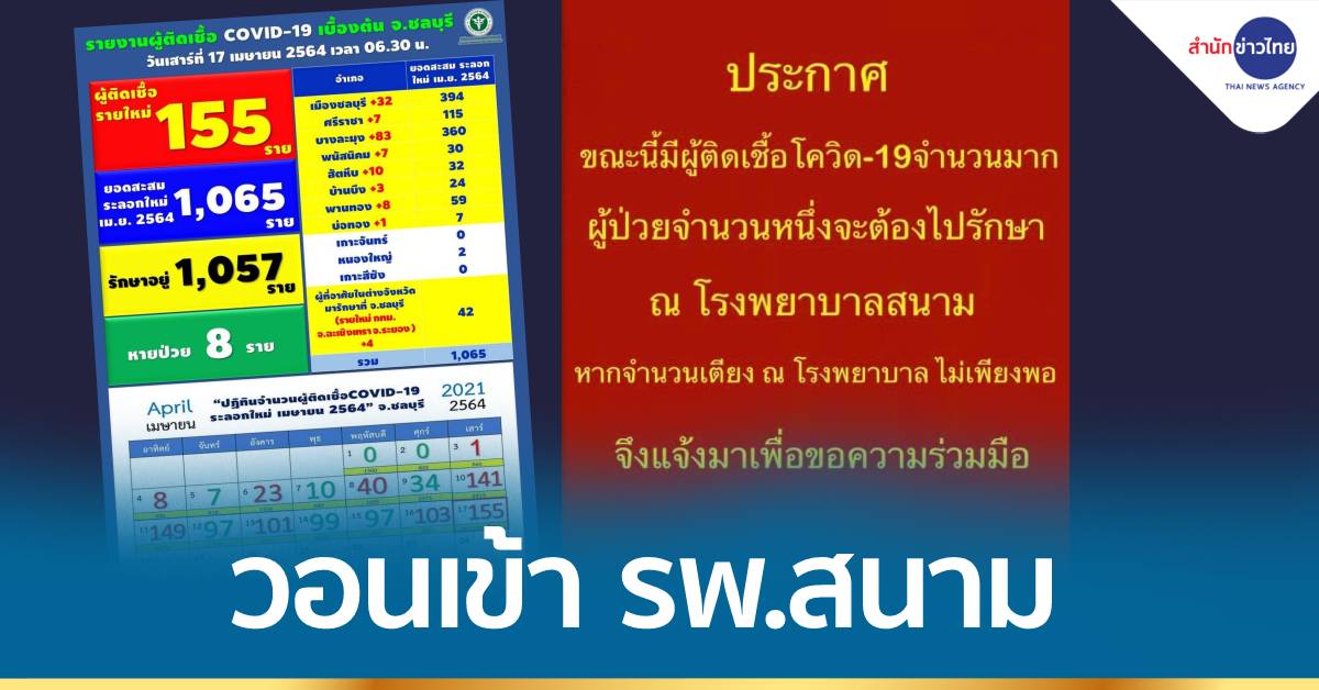 ชลบุรี 17 เม.ย.-สสจ.ชลบุรี ขอความร่วมมือผู้ป่วยโควิดยอมเข้ารักษาใน รพ.สนาม หลังจากที่มีผู้ติดเชื้อจำนวนมากเกินกว่าที่ รพ.หลักจะรองรับได้ หากผู้ป่วยรายใดไม่ปฏิบัติตาม อาจจะถูกดำเนินการตามกฎหมายต่อไป