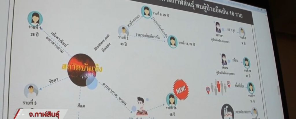 สำหรับรายล่าสุดอยู่ในกลุ่มเสี่ยงเที่ยวสถานบันเทิง และได้เข้ารับการตรวจหาเชื้อ แต่ระหว่างรอผลการตรวจกลับพบว่าไม่ได้กักตัวเอง เดินทางไปสถานที่ต่างๆ โดยเฉพาะในตัวเมืองกาฬสินธุ์หลายแห่ง ทั้งตลาดสดเทศบาลเมืองกาฬสินธุ์ (หน้า สภ.เมืองกาฬสินธุ์) ร้านตากอากาศ อ.นามน ร้านนุชไก่สด ตลาดเกษตร อ.เมือง ร้าน KFC สาขากาฬสินธุ์พลาซ่า เป็นต้น