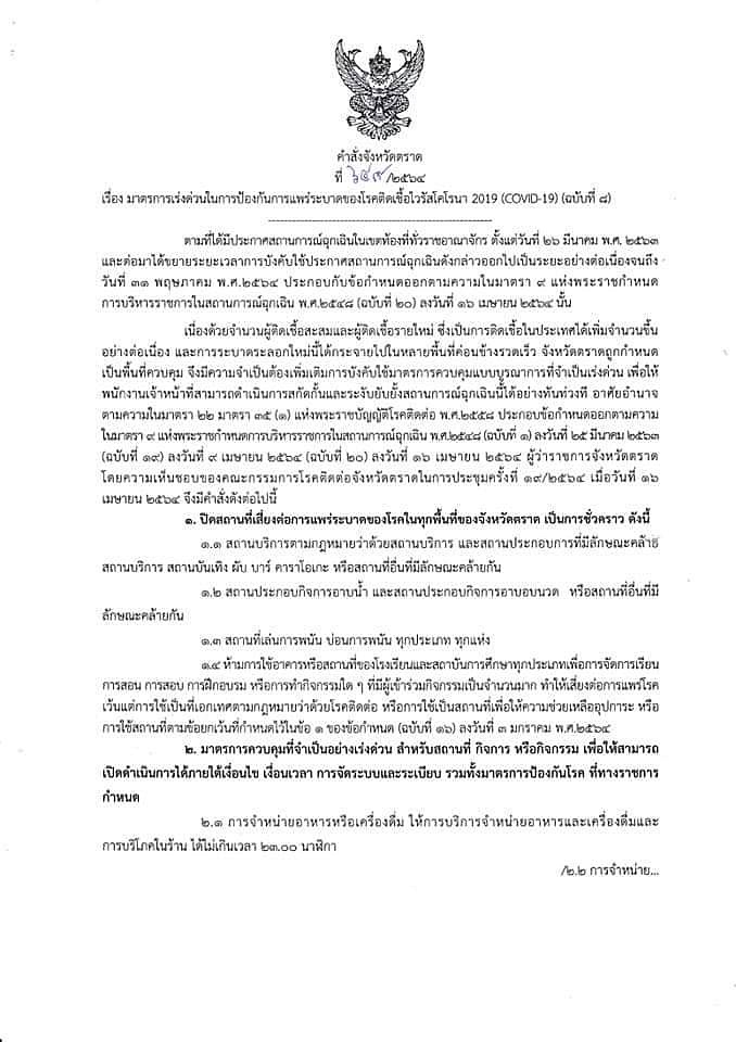 1.ปิดสถานที่เสี่ยงต่อการแพร่ระบาดของโรคในทุกพื้นที่ของจังหวัดตราดเป็นการชั่วคราว ได้แก่ สถานบริการ สถานบันเทิง ผับ บาร์ คาราโอเกะ อาบอบนวด สถานที่เล่นการพนัน บ่อนการพนันทุกประเภท รวมทั้งห้ามใช้อาคารสถานที่ของโรงเรียน สถาบันการศึกษาทุกประเภทในการจัดการเรียนการสอน การสอบ การฝึกอบรม
