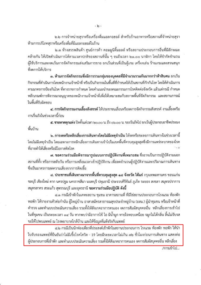 “กรณีนักท่องเที่ยวที่มาจาก18 จังหวัดพื้นที่สีแดง ที่ประสงค์เข้าพักในโรงแรม ห้องพัก หอพัก ให้นำใบรับรองแพทย์ที่ยืนยันว่าไม่มีเชื้อโควิด-19 ที่ออกให้ไม่เกิน 72 ชั่วโมงก่อนการเดินทาง มาแสดงต่อผู้ประกอบการโรงแรมที่เข้าพัก และทำแบบประเมินความเสี่ยง รวมทั้งขอให้หลีกเลี่ยงเข้าไปในชุมชนเป็นเวลา 14 วันด้วย”