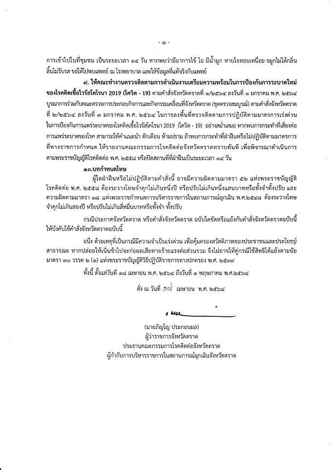 นายภิญโญ ประกอบผล ผู้ว่าราชการจังหวัดตราด ในฐานะประธานคณะกรรมการโรคติดต่อจังหวัดตราด ได้ลงนามในคำสั่งจังหวัดตราด ที่ 649/2564 ลงวันที่ 17 เม.ย.64 ออกมาตรการเพิ่มเติมเร่งด่วน เพื่อให้พนักงานเจ้าหน้าที่สามารถดำเนินการสกัดกั้นและระงับยับยั้งการระบาดของโรคโควิด-19 ระลอกใหม่ได้ทันท่วงที โดยผ่านความเห็นชอบของคณะกรรมการโรคติดต่อจังหวัดฯ ในการประชุมเมื่อวันที่ 16 เม.ย.ที่ผ่านมา ดังนี้