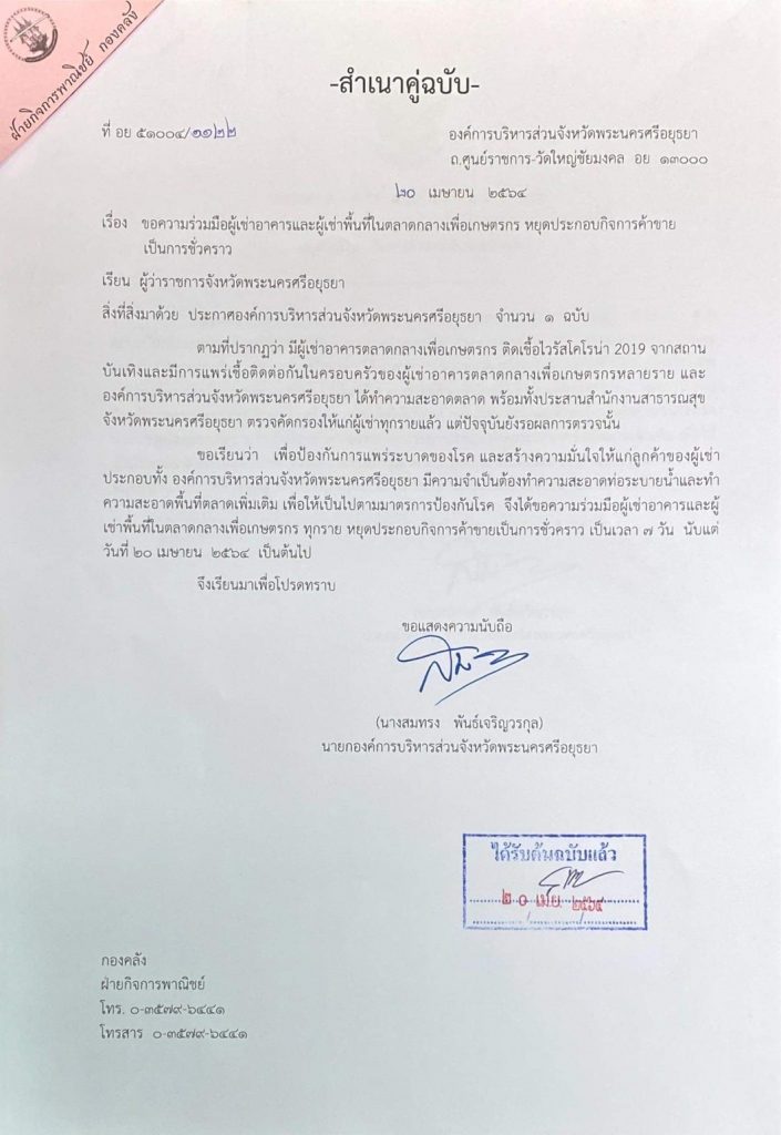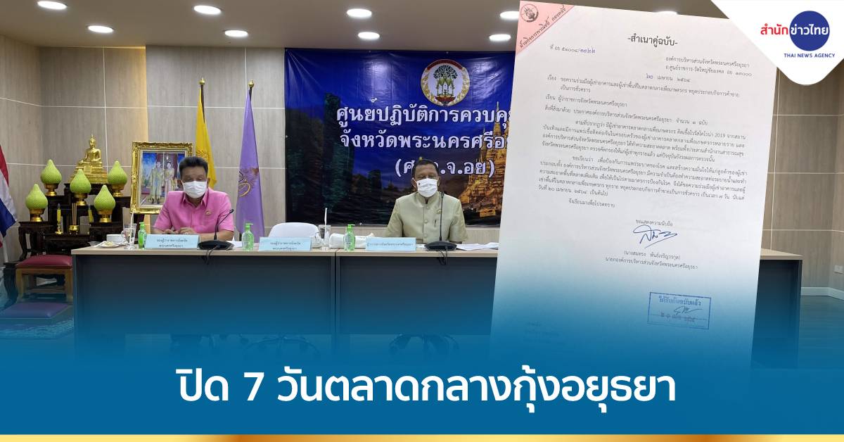 ส่วนผลการตรวจคัดกรองเชิงรุกในพื้นที่ตลาดกลางเพื่อเกษตรกร (ตลาดกลางกุ้งอยุธยา) ที่ตรวจไปครั้งแรกเมื่อวันที่ 18 เม.ย.64 ตรวจหาเชื้อ 742 คน พบผู้ติดเชื้อ 6 คน ตรวจครั้งที่ 2 ตรวจหาเชื้อ 610 ราย พบติดเชื้ออีก 5 ราย ในจำนวนนี้เป็นลูกค้าที่มาใช้บริการที่ตลาด 2 ราย ที่ประชุมจึงเสนอให้ปิดตลาดกลางกุ้งอีก 7 วันตั้งแต่วันที่ 21 เม.ย.นี้เป็นต้นไป พร้อมกับทำการตรวจคัดกรองเชิงรุกอีกครั้งในวันที่ 23 เม.ย.นี้ เพื่อเร่งควบคุมไม่ให้เชื้อแพร่กระจาย และหลังการตรวจในวันที่ 23 เม.ย.แล้ว จะประชุมประเมินสถานการณ์ว่าจะปิดตลาดต่อไปหรือไม่อย่างไร