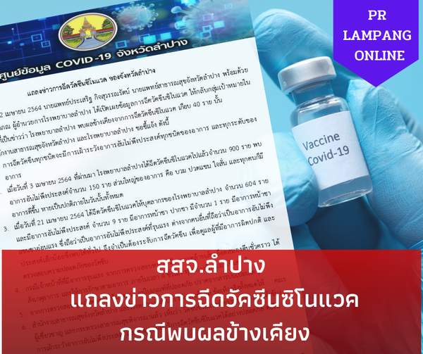 วันที่ 22 เมษายน 2564 นายแพทย์ประเสริฐ กิจสุวรรณรัตน์ นายแพทย์สาธารณสุขจังหวัดลำปาง พร้อมด้วย นายแพทย์พงษ์ศักดิ์ โสภณ ผู้อำนวยการโรงพยาบาลลำปาง ได้เปิดเผยข้อมูลการฉีควัคซีนซิโนแวค ให้กลับกลุ่มเป้าหมายในจังหวัดลำปาง ซึ่งตามที่เป็นข่าวว่า โรงพยาบาลลำปาง พบผลข้างเคียงจากการฉีดวัคซีนซิโนแวค เกือบ 40 ราย นั้น