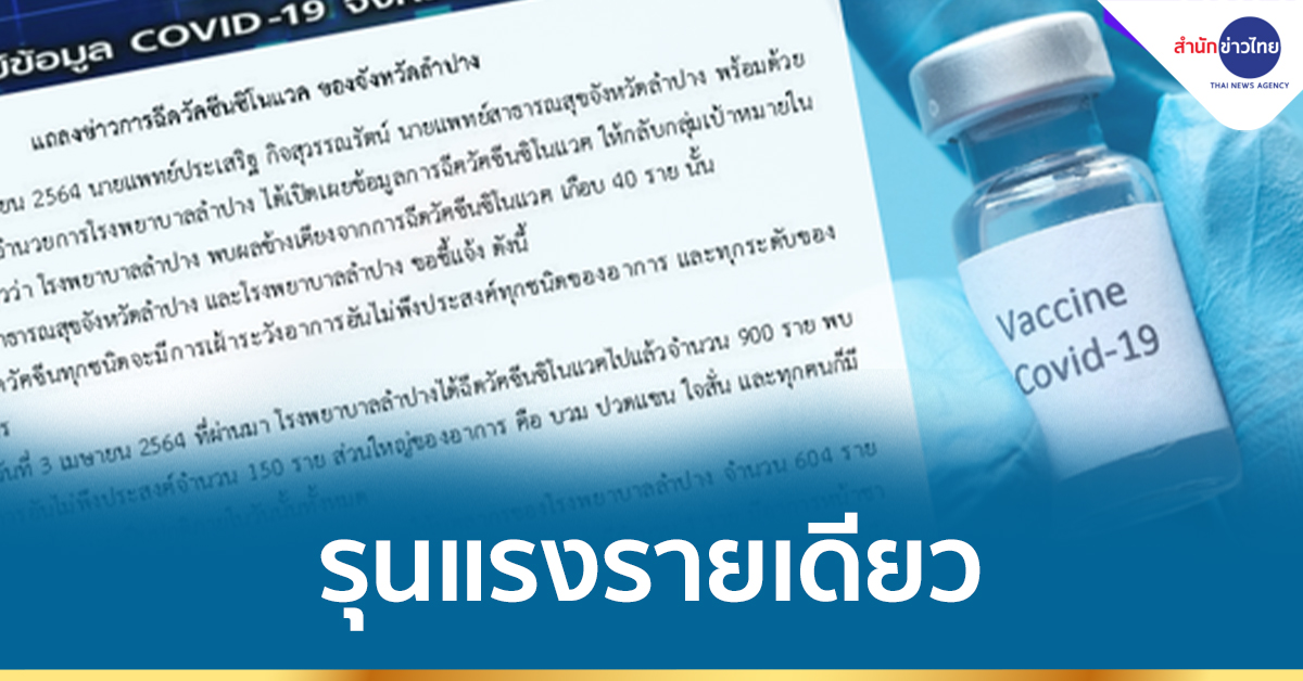 ลำปาง 22 เม.ย.-สสจ.ลำปาง แจงกรณีฉีดวัคซีนซิโนแวค มีอาการไม่พึงประสงค์ รุนแรงเพียงรายเดียว คล้ายเส้นเลือดสมองตีบชั่วคราว รักษาตามอาการ ภายในเวลา 4 ชั่วโมง ทุกอย่างก็กลับมาเป็นปกติ