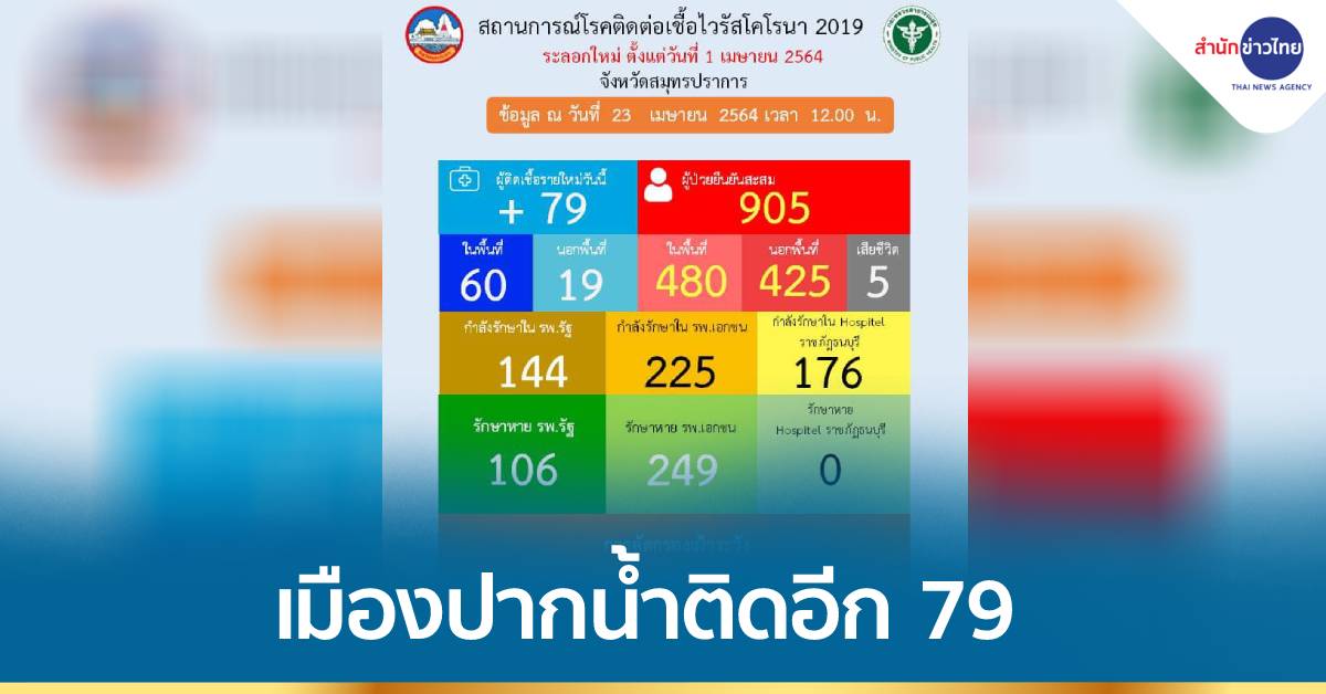 สมุทรปราการ 23 เม.ย.-สมุทรปราการพบติดโควิดรายใหม่ 79 ราย เสียชีวิตอีก 2 ราย รวมผู้ป่วยสะสม 905 ราย เสียชีวิตรวม 5 ราย