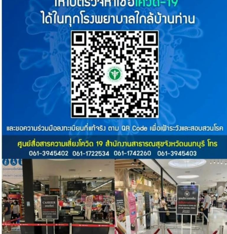 สำนักงานสาธารณสุขจังหวัดนนทบุรี แจ้งขอความร่วมมือประชาชนที่ใช้บริการที่แผนกเบเกอรี่ และซูเปอร์มาร์เก็ต ของห้างสรรพสินค้าเดอะมอลล์ งามวงศ์วาน ชั้น G ในช่วงวันที่ 13-21 เมษายน 2564 ให้ไปตรวจหาเชื้อโควิดฟรี ที่โรงพยาบาลใกล้บ้าน และขอความร่วมมือลงทะเบียนที่แท้จริงตาม QR CODE เพื่อเฝ้าระวังและสอบสวนโรค หลังพบผู้ติดเชื้อ 4 ราย