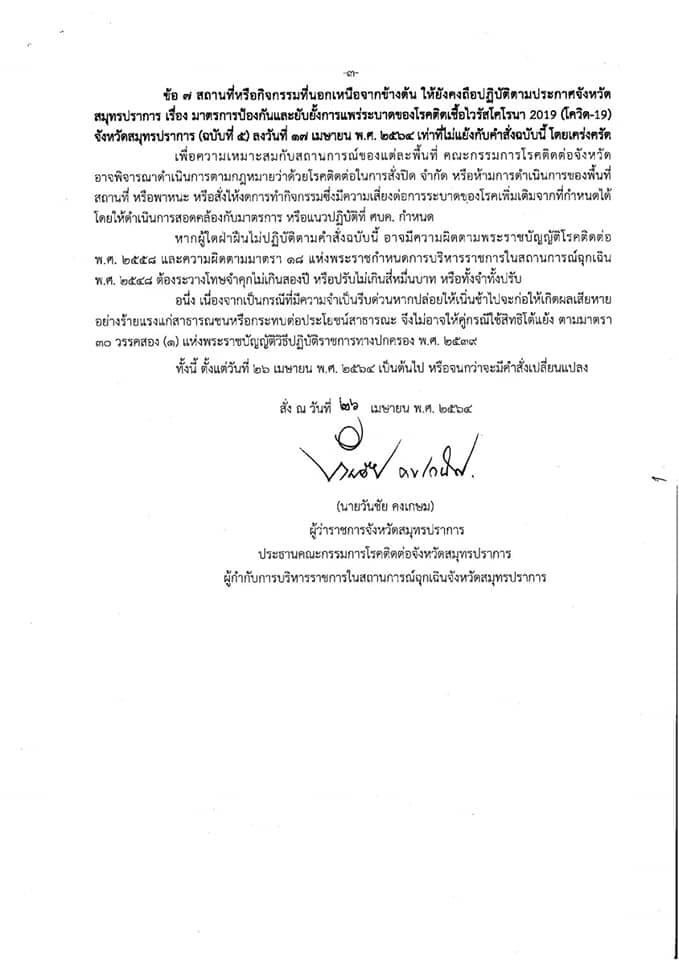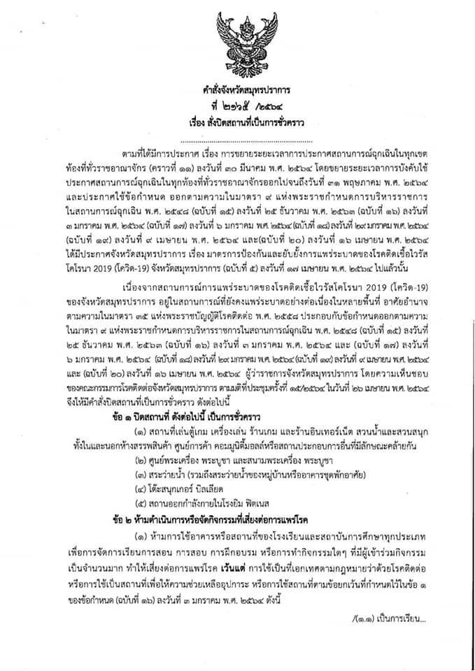 นายวันชัย คงเกษม ผู้ว่าราชการจังหวัดสมุทรปราการ ในฐานะประธานคณะกรรมการโรคติดต่อจังหวัดสมุทรปราการ ออกคำสั่งที่ 2165/2564 เรื่อง สั่งปิดสถานที่เป็นการชั่วคราว เพื่อป้องกันและยับยั้งการแพร่ระบาดเชื้อโควิด-19 โดยความเห็นชอบของคณะกรรมการโรคติดต่อจังหวัดสมุทรปราการ จึงให้มีคำสั่งปิดสถานที่เป็นการชั่วคราว ดังต่อไปนี้