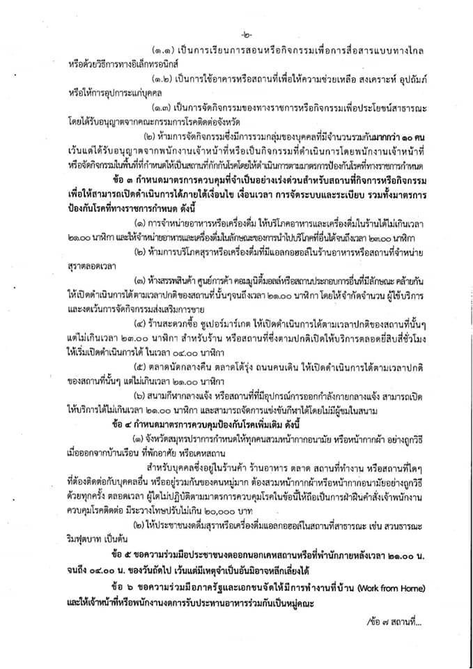 กรณีการจำหน่ายอาหาร หรือเครื่องดื่ม ให้บริโภคอาหารและเครื่องดื่มในร้านได้ไม่เกินเวลา 21.00 น. และให้จำหน่ายไปปริโภคที่อื่นได้จนถึงเวลา 23.00 น. ห้ามการบริโภคสุราหรือเครื่องดื่มที่มีแอลกอฮอล์ในร้านอาหารหรือสถานที่จำหน่ายสุราตลอดเวลา ขณะที่ห้างสรรพสินค้า ศูนย์การค้า คอมมูบิตี้มอลล์หรือสถานประกอบการอื่นที่มีลักษณะ คล้ายกัน ให้เปิดตำเนินการได้ตามเวลาปกติของสถานที่นั้นๆจนถึงเวลา 21.00 น.โดยให้จำกัดจำนวน ผู้ใช้บริการ และงดเว้นการจัดกิจกรรมส่งเสริมการขาย