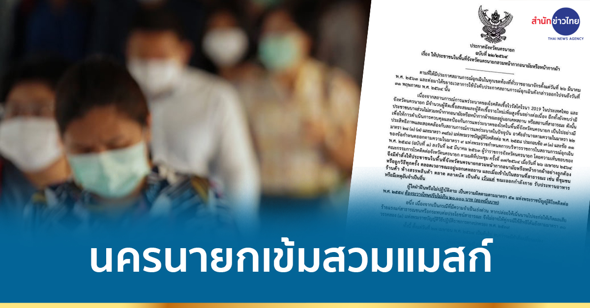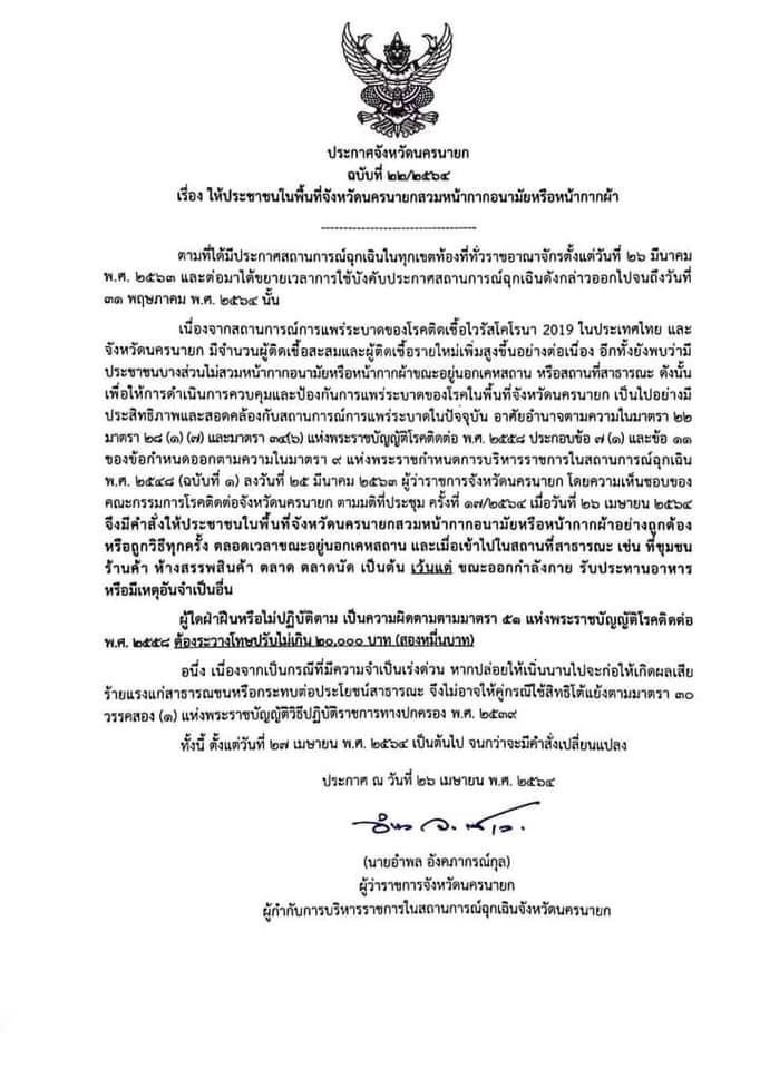 นายอำพล อังคภากรณ์กุล ผู้ว่าราชการจังหวัดนครนายก ในฐานะผู้กำกับการบริหารราชการในสถานการณ์ฉุกเฉินจังหวัดนครนายก ออกคำสั่งเรื่องให้ประชาชน ในพื้นที่จังหวัดนครนายกสวมหน้ากากอนามัยหรือหน้ากากผ้า เนื่องจากสถานการณ์การแพร่ระบาดของโรคติดเชื้อไวรัสโคโรนา 2019 ในประเทศไทย และจังหวัดนครนายก มีจำนวนผู้ติดเชื้อสะสมและผู้ติดเชื้อรายใหม่เพิ่มสูงขึ้นอย่างต่อเนื่อง อีกทั้งยังพบว่ามีประชาชนบางส่วนไม่สวมหน้ากากอนามัยหรือหน้ากากผ้า ขณะอยู่นอกเคหสถาน หรือสถานที่สาธารณะ ดังนั้นเพื่อให้การดำเนินการควบคุมและป้องกันการแพร่ระบาตของโรคในพื้นที่จังหวัดนครนายก เป็นไปอย่างมีประสิทธิภาพและสอดคล้องกับสถานการณ์การแพร่ระบาดในปัจจุบัน อาศัยอำนาจตามความในมาตรา 22 มาตรา 28 (3) (7) และมาตรา 34(6) แห่งพระราชบัญญัติโรคติตต่อ พ.ศ. 2548ประกอบข้อ 7(1) และข้อ 11 ของข้อกำหนดออกตามความในมาตรา 9 แห่งพระราชกำหนตการบริหารราชการในสถานการณ์ฉุกเฉิน พ.ศ. 2548 (ฉบับที่ 3 ) ลงวันที่ 25 มีนาคม 2563 ผู้ว่าราชการจังหวัดนครนายก โดยความเห็นชอบของคณะกรรมการโรคติดต่อจังหวัดนครนายก ตามมติที่ประชุม ครั้งที่ 17/2564 เมื่อวันที่ 26 เมษายน 2564 จึงมีคำสั่งให้ประชาชนในพื้นที่จังหวัดนครนายก สวมหน้ากากอนามัยหรือหน้ากากผ้าอย่างถูกต้อง หรือถูกวิธีทุกครั้ง ตลอดเวลาขณะอยู่นอกเคหสถาน และเมื่อเข้าไปในสถานที่สาธารณะ เช่น ที่ ชุมชน ร้านค้า ห้างสรรพสินค้า ตลาด ตลาดนัด เป็นต้น เว้นแต่ ขณะออกกำลังกาย รับประทานอาหารหรือมีเหตุอันจำเป็นอื่น
