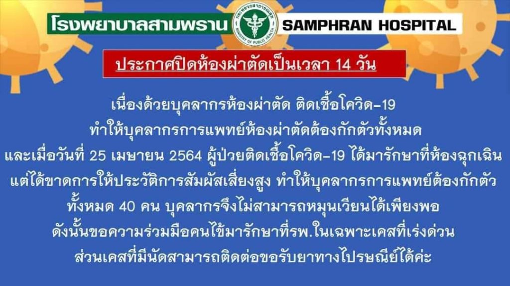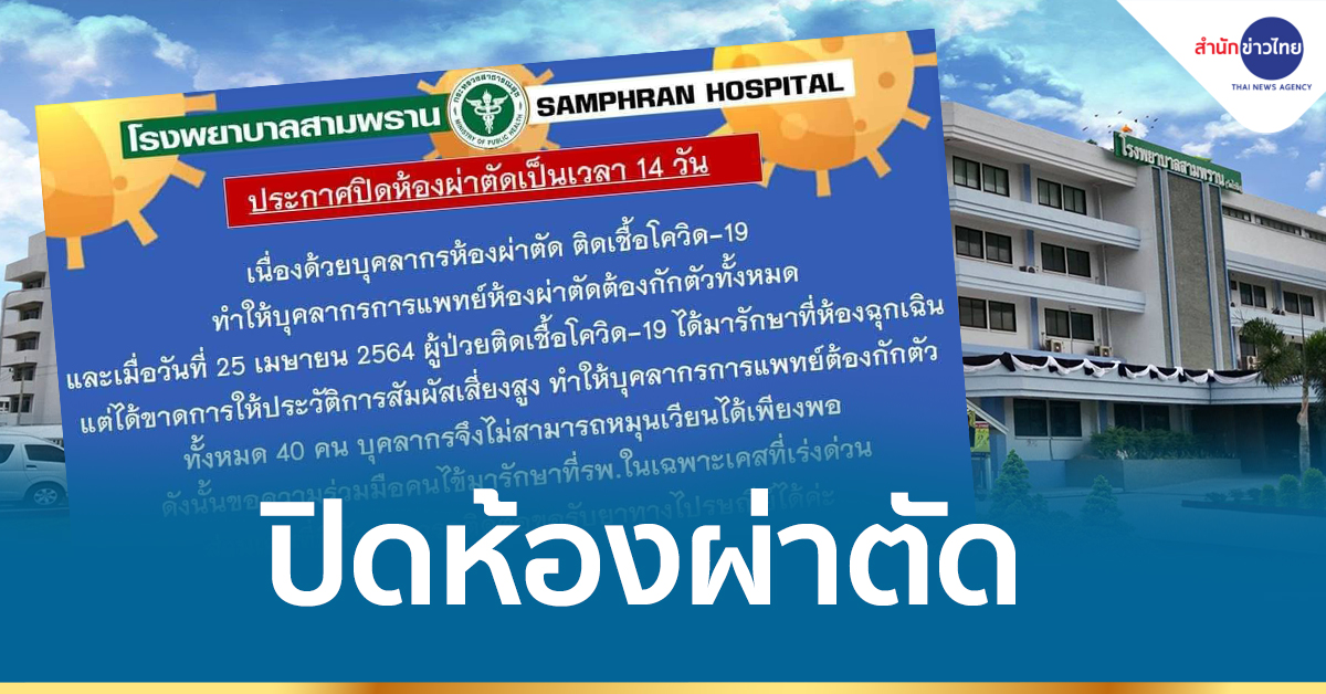 โรงพยาบาลสามพราน จ.นครปฐม ประกาศปิดห้องผ่าตัดชั่วคราว เป็นเวลา 14 วัน ตั้งแต่วันที่ 27 เม.ย.จนถึงวันที่ 10 พ.ค.64 หลังจากบุคลากรห้องผ่าตัดติดเชื้อโควิด-19 ทำให้บุคลากรทางการแพทย์ห้องผ่าตัดต้องกักตัวทั้งหมด