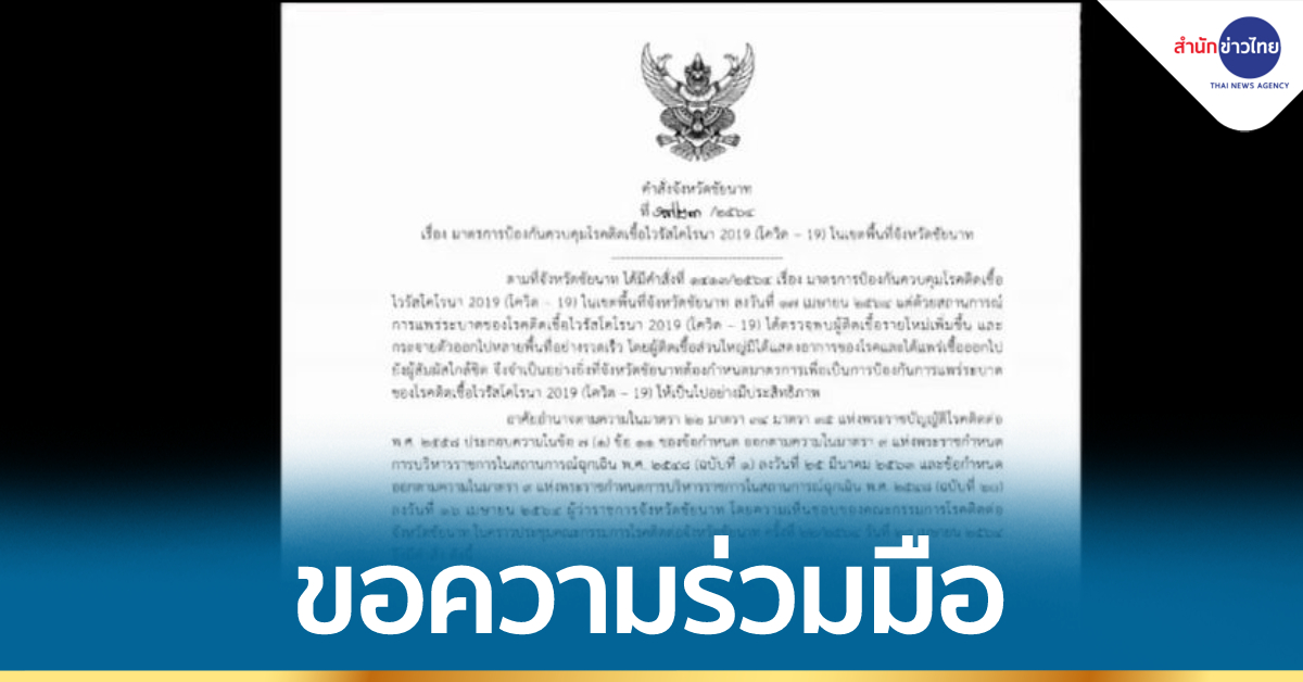 ชัยนาท 29 เม.ย. – ผู้ว่าฯ ชัยนาท มีคำสั่งขอความร่วมมือประชาชนงดออกนอกเคหสถานในเวลา 23.00-04.00 น. พร้อมคำสั่งให้สวมหน้ากากอนามัยหรือหน้ากากผ้าตลอดเวลาที่ออกนอกเคหสถาน