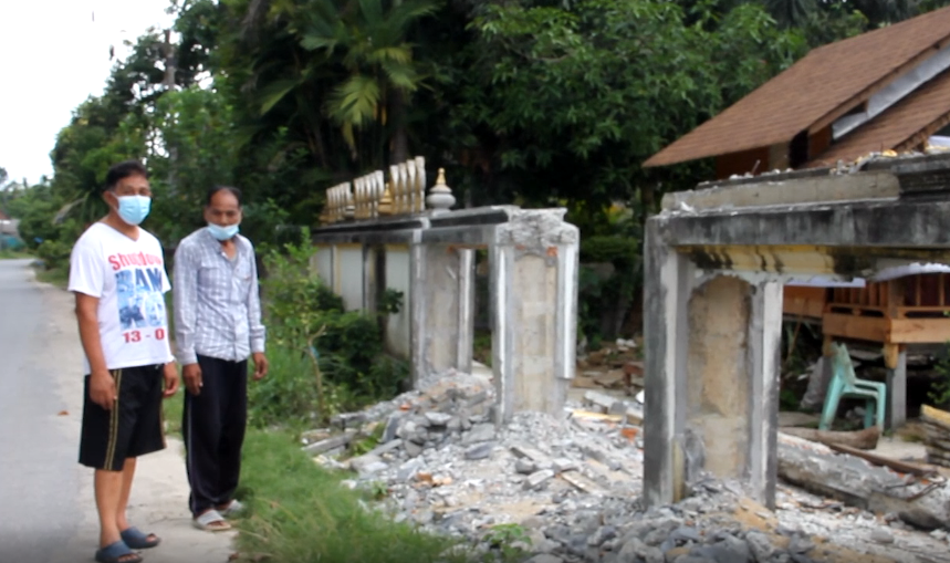 ทางด้านนายสมคิด ไชยคชเดช ชาวบ้าน ต.กะปาง อ.ทุ่งสง จ.นครศรีธรรมราช กล่าว่า ตนเป็นผู้นำชาวบ้านที่ได้ตั้งให้เป็นผู้นำในเรื่องนี้ โดยมีปัญหามาจากรถโรงเรียนที่เข้าออกในวัดวันละหลายรอบ ส่งผลให้เกิดปัญหาฝุ่นละออง รวมถึงเวลามีงานของวัดจะไม่มีที่จอดสำหรับคนที่มาร่วมกิจกรรม เพราะครูของโรงเรียนนำรถเข้ามาจอดเต็มวัด ต่อมาชาวบ้านได้หารือกันว่าน่าจะทุบกำแพงทำทางเข้าวัดแทนทางเดิมเพื่อความสะดวก จึงบอกกับพระที่อยู่ภายในวัดและได้ช่วยกันดำเนินการทุบกำแพงเพื่อจะทำถนนเข้าออกโดยชาวบ้านก็ได้ลงขันเงินกันเอง ซึ่งเป็นประโยชน์กับสาธารณะ