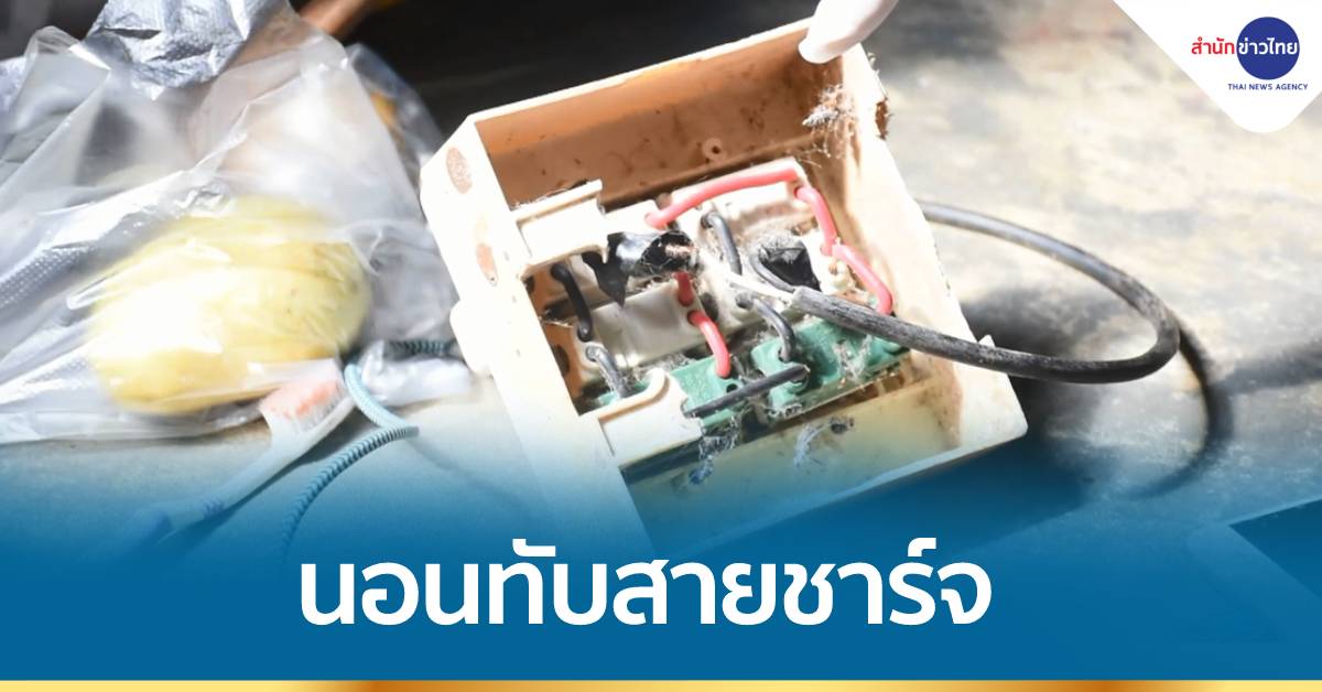 เจ้าหน้าที่ตรวจสอบในห้องนอน พบอุปกรณ์สายชาร์จโทรศัพท์วางอยู่ข้างตัว พร้อมกับปลั๊กพ่วงสายไฟ ที่ดัดแปลงทำมาจากกล่องปลั๊กไฟติดผนัง โดยที่ด้านหลังกล่องปลั๊กไฟมีสภาพเปลือย และยังพบมีสายไฟที่ต่อเข้ากับตัวปลั๊กสภาพชำรุดจนเห็นลวดทองแดงโผล่ออกมา