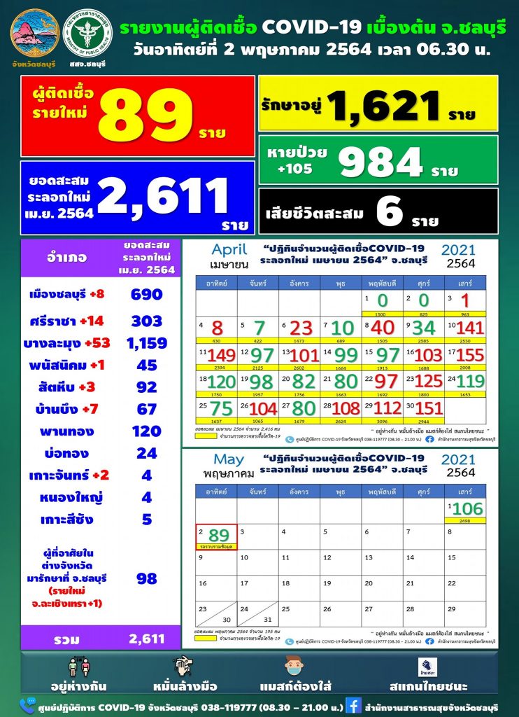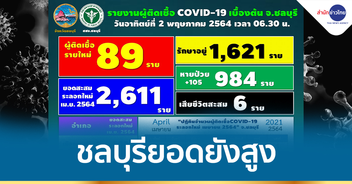 ชลบุรี 2 พ.ค.-ชลบุรียอดติดเชื้อยังสูง วันนี้พบผู้ติดเชื้อโควิด-19 เพิ่มอีก 89 ราย สะสมระลอกใหม่ 2,611 ราย ยังรักษาตัวอยู่ 1,621 ราย หายป่วยแล้ว 984 ราย