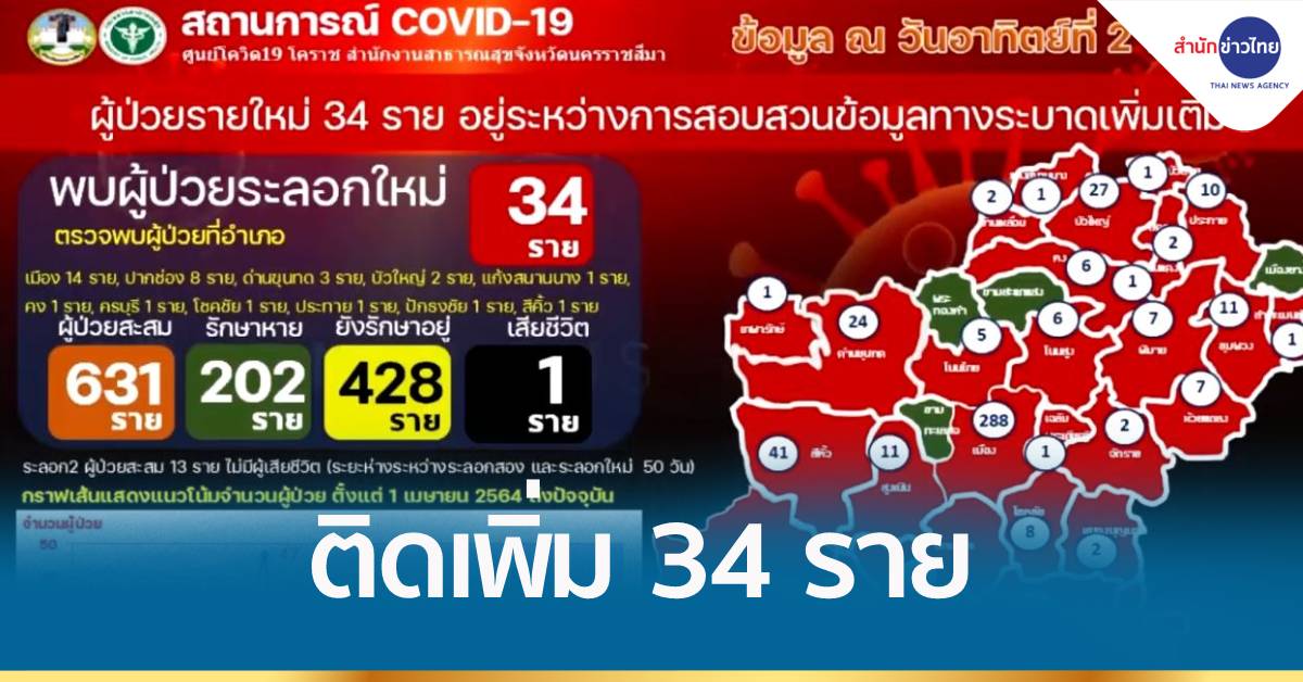 ผู้ว่าฯ นครราชสีมา ได้รับรายงานพบผู้ติดเชื้อโควิด-19 รายใหม่เพิ่มอีก 34 ราย แยกเป็น อ.เมือง 14 ราย ปากช่อง 8 ราย ด่านขุนทด 3 ราย บัวใหญ่ 2 ราย แก้งสนามนาง 1 ราย คง 1 ราย ครบุรี 1 ราย โชคชัย 1 ราย ประทาย 1 ราย ปักธงชัย 1 ราย และสีคิ้ว 1 ราย รวมยอดผู้ติดเชื้อระลอกใหม่สะสม 631 ราย พบการระบาดใน 28 อำเภอ จากทั้งหมด 32 อำเภอ