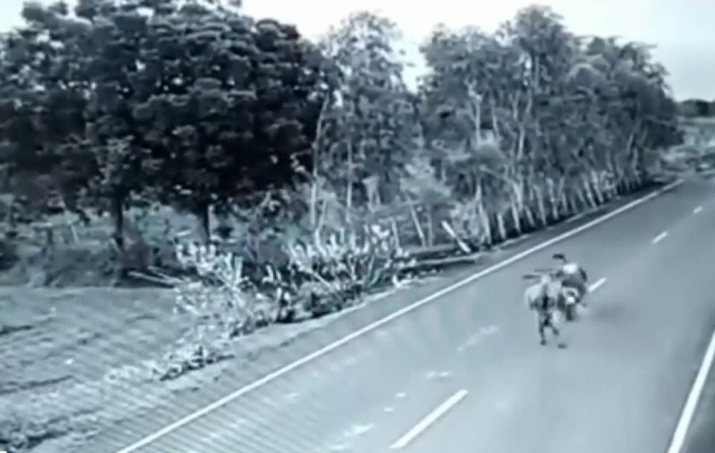ผู้ใช้เฟชบุ๊กรายหนึ่ง นำคลิปวิดีโอจากกล้องวงจรปิดมาโพสต์เตือนภัยว่า “สามีเกือบเอาชีวิตมาทิ้งไว้กะวัวเด่นิ เลิกงานมาถึงบ้านเปิดกล้องดู เกือบแล้วไหมละ #ทั้งสงสาร ทั้งขำ ดีที่บิดรถหนีทัน เกือบเหลือแต่ชื่อแล้ว 55555”