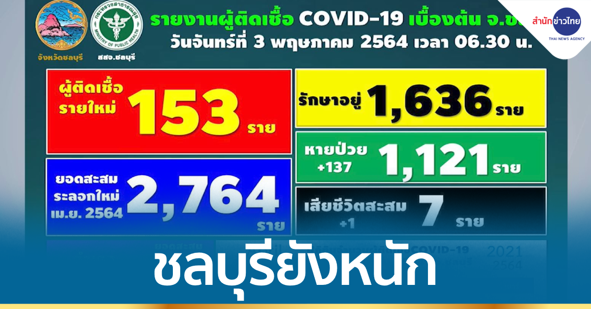 เฟซบุ๊กเพจสำนักงานสาธารณสุขจังหวัดชลบุรี รายงานตัวเลขผู้ติดเชื้อโควิด-19 วันนี้ มีผู้ติดเชื้อรายใหม่ จำนวน 153 คน และเสียชีวิต 1 คน ทำให้มียอดสะสมผู้ป่วยอยู่ที่ 2,764 คน รักษาตัวอยู่ที่โรงพยาบาล 1,636 คน และเสียชีวิตรวม 7 คน โดยผู้ที่ติดเชื้อส่วนใหญ่มาจากสถานบันเทิงในกรุงเทพมหานคร และแพร่ระบาดมายังสถานบันเทิงในจังหวัดชลบุรี รวมถึงวงสังสรรค์และการเดินทางไปต่างจังหวัด