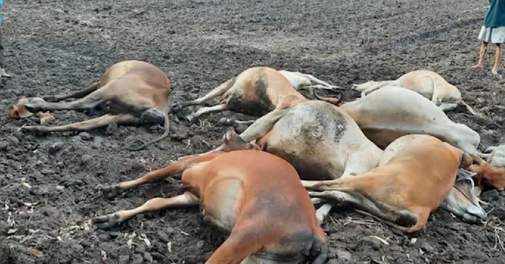 ร้อยเอ็ด 4 พ.ค. – ชาวบ้าน อ.เกษตรวิสัย จ.ร้อยเอ็ด เสียใจ ฟ้าฝ่าวัวตายกลางทุ่ง 11 ตัว สูญเงินหลายแสนบาท เชื่อเป็นเหตุอาเพศ เตรียมทำพิธีแก้เคล็ด เพราะหน้าฝนปีที่ผ่านมา ฟ้าก็ผ่าวัวชาวบ้านตายกว่า 10 ตัว