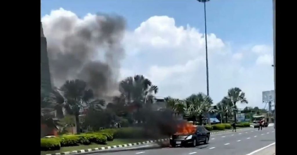 ที่เกิดเหตุพบเจ้าหน้าที่หน่วยบรรเทาสาธารณภัยเมืองพัทยา พร้อมรถดับเพลิงเมืองพัทยา กำลังช่วยกันระดมฉีดน้ำกับไฟที่กำลังโหมลุกไหม้รถเก๋งยี่ห้อนิสสัน เทียน่า สีดำ ทะเบียน 1กศ1461 กรุงเทพมหานคร เจ้าหน้าที่ใช้เวลานานกว่า 10 นาที จึงสามารถดับไฟได้ ส่วนตัวรถได้รับความเสียหายทั้งคัน