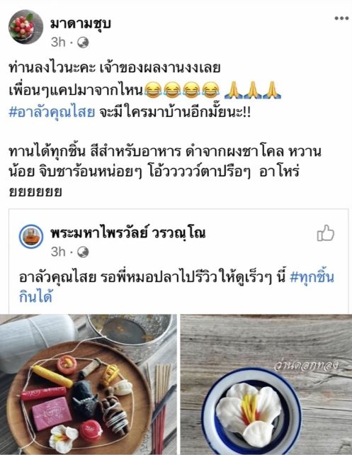 ล่าสุดวันนี้ (6 พ.ค.) เพจดังกล่าวได้โพสต์ภาพ พร้อมข้อความระบุว่า “ท่านลงไวนะคะ เจ้าของผลงานงงเลย เพื่อนๆ แคปมาจากไหน #อาลัวคุณไสย จะมีใครมาบ้านอีกมั้ยนะ!! ทานได้ทุกชิ้น สีสำหรับอาหาร ดำจากผงชาร์โคล หวานน้อย จิบชาร้อนหน่อยๆ โอ้ววววว์ ตาปรือๆ อาโหร่ยยยยยย”
