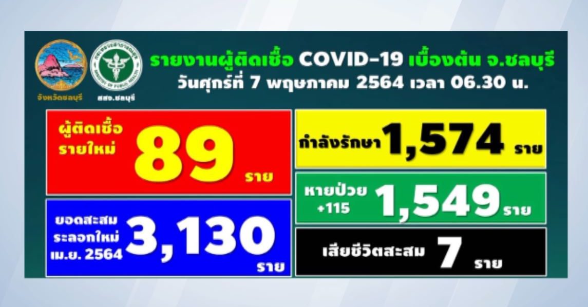 ชลบุรี 7 พ.ค.- สสจ.ชลบุรี รายงานวันนี้ มีผู้ติดเชื้อโควิด-19 รายใหม่เพิ่มอีก 89 คน ทำให้ยอดสะสมระลอกใหม่รวม 3,130 คน และรอผลตรวจยืนยันกลุ่มเสี่ยงอีกกว่า 1,200 คน