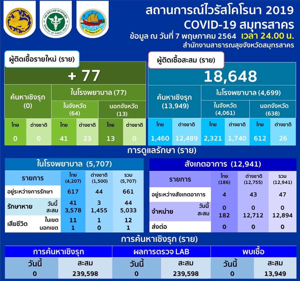 ขณะที่ สสจ.สมุทรสาคร รายงานสถานการณ์โควิด ข้อมูลวันที่ 7 พฤษภาคม 2564 เวลา 24.00 น. จังหวัดสมุทรสาครมีผู้ป่วยรายใหม่ 77 ราย รวมผู้ป่วยยืนยันสะสม 18,648 ราย หายป่วยแล้ว 17,927 ราย เสียชีวิตสะสม 13 ราย.-สำนักข่าวไทย