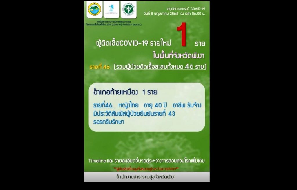 พังงา 9 พ.ค.-พังงา พบผู้ป่วยเพิ่ม 4 ราย นายอำเภอสั่งตั้งด่านล็อกดาวน์กลุ่มเสี่ยงในหมู่บ้าน หลังพบผู้ป่วยเพิ่มและกลุ่มเสี่ยงบางคนไม่กักตัวจริง ธนาคารกสิกรพังงา พบพนักงานติดโควิด 1 ราย
