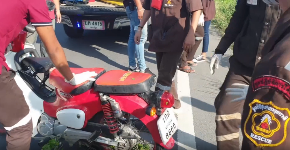 ที่เกิดเหตุเป็นถนนริมคลองชลประทาน หมู่ 7 ต.สามควายเผือก พบผู้เสียชีวิตสภาพนอนคว่ำหน้า แขนซ้ายโอบกอดลูกชายวัยขวบเศษที่นั่งร้องไห้อยู่ ห่างเข้าไปพงหญ้าประมาณเกือบ 10 เมตร พบรถจักรยานยนต์ฮอนด้า สีแดง ทะเบียน 1 กด-8866 นครปฐม ตรวจสอบไม่พบเอกสารติดตัวแสดงว่าเป็นใคร ชื่ออะไร มาจากไหน ในที่เกิดเหตุยังพบขวดนมสีชมพูตกอยู่ 1 ขวด คาดเสียชีวิตมาแล้ว 5-8 ชั่วโมง