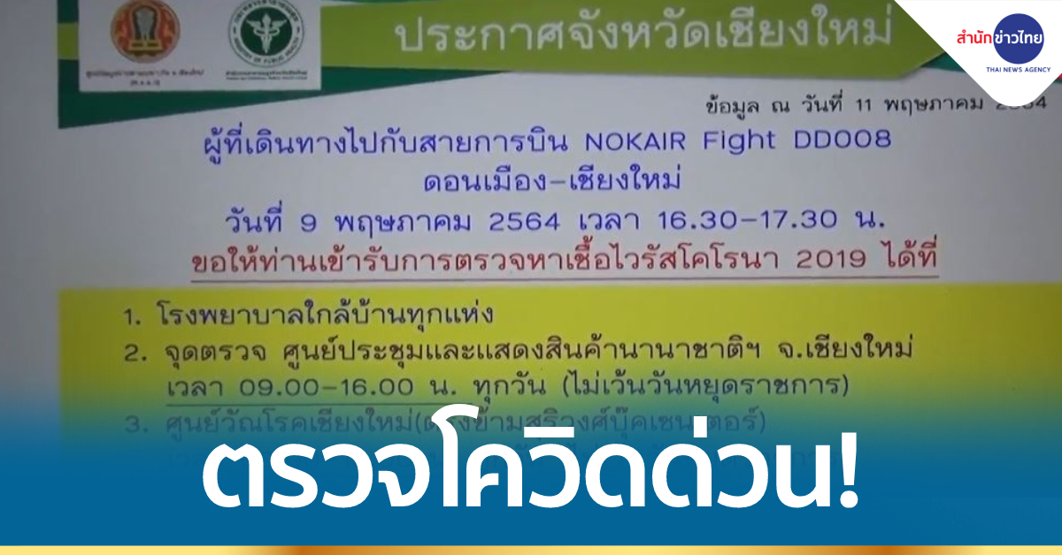 เชียงใหม่ 11 พ.ค. – สาธารณสุข จ.เชียงใหม่ แจ้งเตือนผู้โดยสารสายการบินนกแอร์ วันที่ 9 พ.ค. เที่ยวบิน DD008 เส้นทางดอนเมือง-เชียงใหม่ เวลา 16.30-17.30 น. ไปตรวจหาเชื้อโควิด-19 ด่วน เนื่องจากพบผู้โดยสารเที่ยวบินดังกล่าวติดโควิด-19