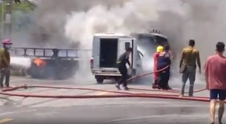 ระยอง 12 พ.ค.-รถส่งผู้ต้องหา สภ.เพ จ.ระยอง พุ่งชนสิบล้อ ไฟลุกท่วม ไหม้วอด 3 ผู้ต้องหา เจ็บสาหัส 1 หวิดถูกย่างสดคารถ