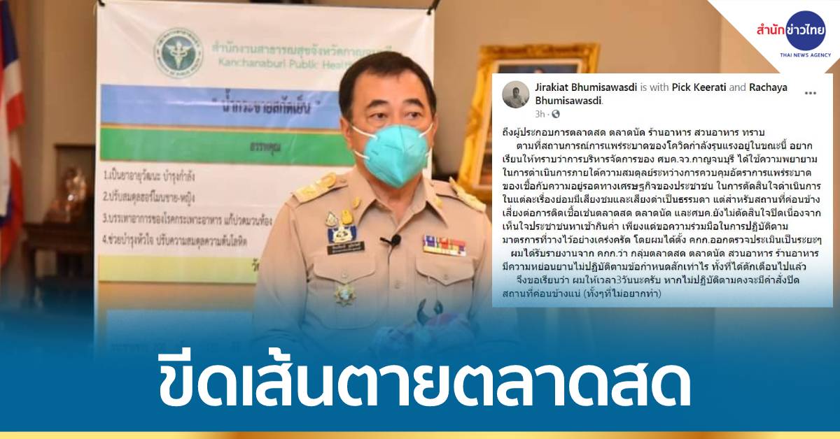 กาญจนบุรี 13 พ.ค.-พ่อเมืองกาญจนบุรีงัดไม้แข็ง เตือนผู้ประกอบการตลาดสด ตลาดนัด ร้านอาหาร ให้ปฏิบัติตามมาตรการสาธารณสุขอย่างเคร่งครัด เพื่อสกัดเชื้อโควิดลุกลาม ขีดเส้นตายให้เวลา 3 วัน ถ้ายังหย่อนยาน จะออกคำสั่งปิดสถานที่ชั่วคราว