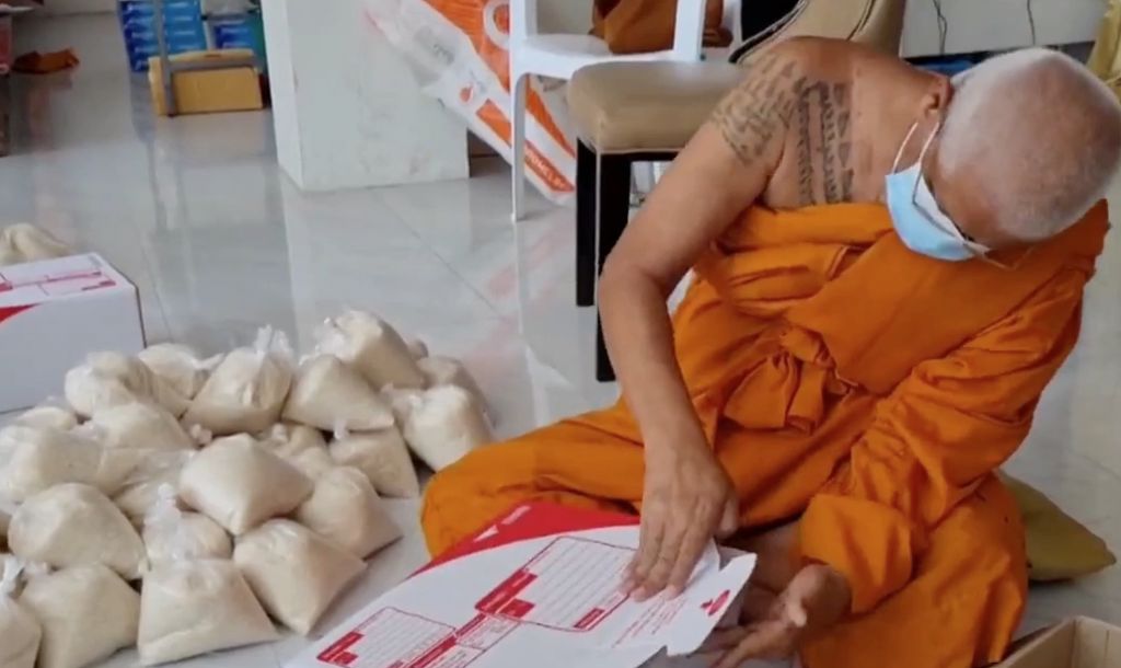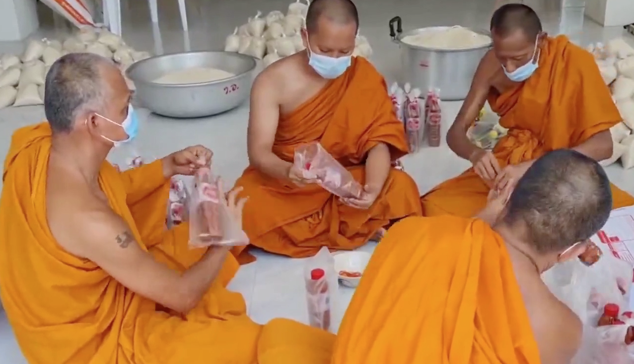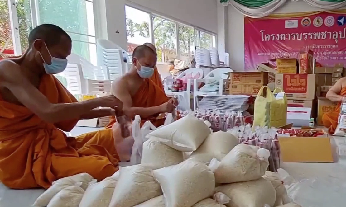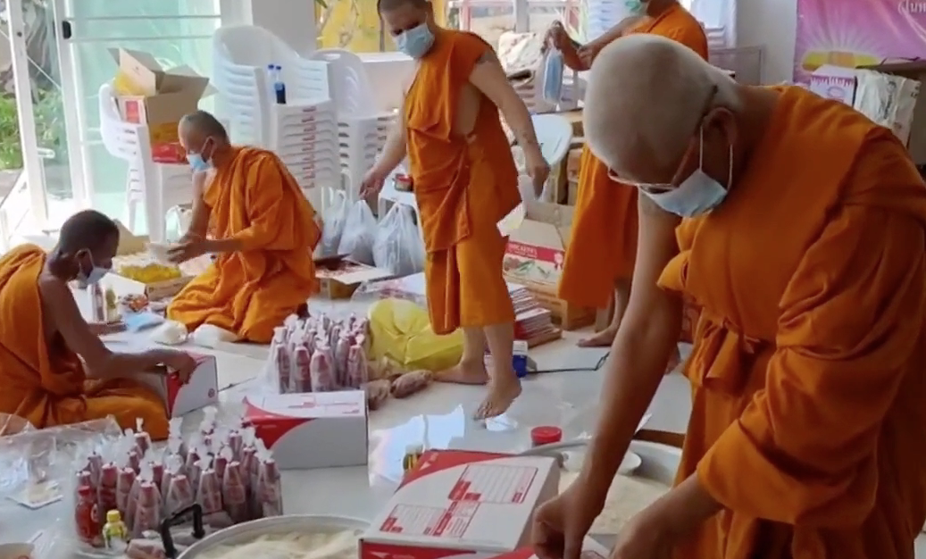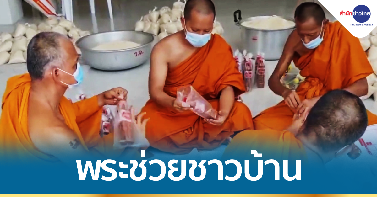 สมุทรสงคราม 12 พ.ค.- คณะสงฆ์วัดอินทาราม จ.สมุทรสงคราม ช่วยกันแพ็กถุงยังชีพ วันละ 30 ชุด ฝาก EMS ส่งไปยังผู้เดือดร้อนจากภัยโควิดทั่วประเทศ