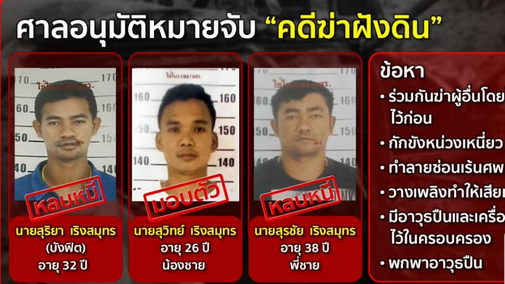 จากนั้นตำรวจจึงขอศาลอนุมัติหมายจับ 3 ผู้ต้องหา ซึ่งเป็นเครือญาติกัน ประกอบด้วยนายสุริยา เริงสมุทร หรือ “บังฟิต” นายสุรชัย เริงสมุทร หรือ “บังกิบหลี” และนายสุวิทย์ เริงสมุทร ก่อนที่นายสุวิทย์จะชิงเข้ามอบตัวเมื่อคืนวันที่ 14 พฤษภาคม พร้อมให้การว่า “บังฟิต” เป็นคนจ่อยิงนายสุชาติ ส่วนตนเองช่วยนำศพไปฝัง จากนั้นเมื่อช่วงเช้าวานนี้ (15 พ.ค.) จึงถูกนำตัวไปชี้จุดเกิดเหตุ และสอบสวนเพื่อขยายผล. – สำนักข่าวไทย