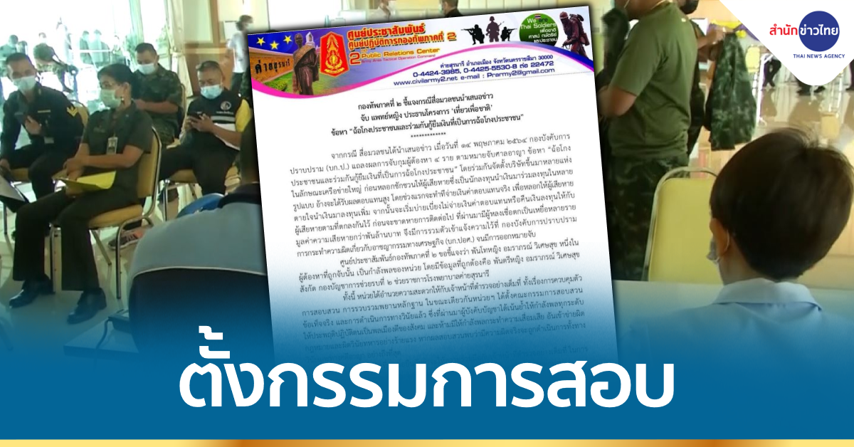 17 พ.ค.-กองทัพภาค 2 ตั้งกรรมการสอบพันตรีแพทย์หญิง เครือข่าย “ประสิทธิ์ เจียวก๊ก” เหตุทำกองทัพเสียหาย ใช้เวลาราชการ-แต่งชุดทหารร่วมขบวนการหรือไม่ ยันให้ความร่วมมือ ตร.เต็มที่