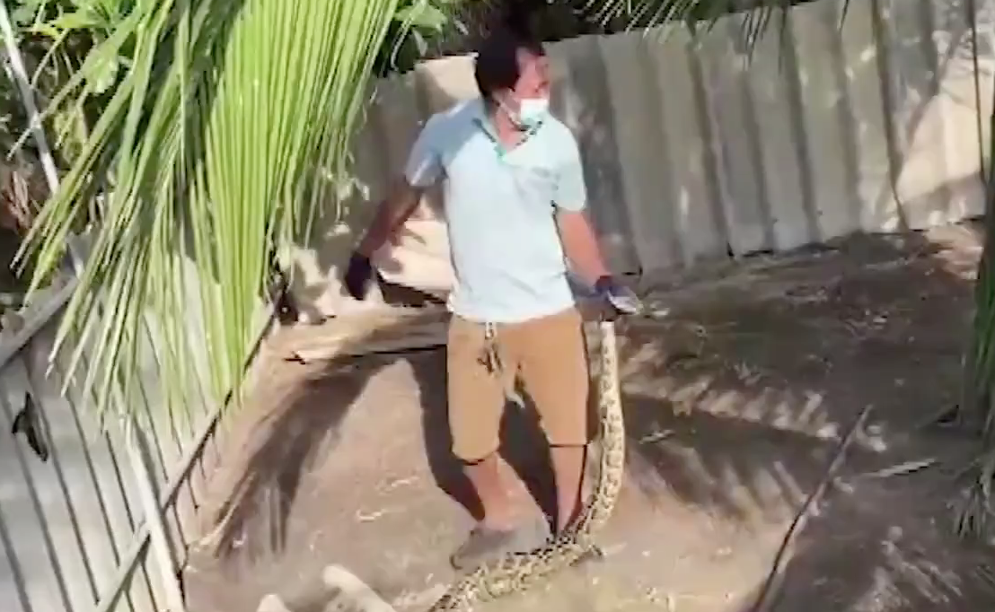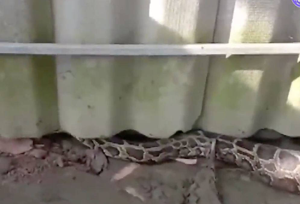 ผู้สื่อข่าวไปที่ 111/24 ม.10 ต.หนองอิรุณ อ.บ้านบึง จ.ชลบุรี พร้อมกับอาสากู้ภัยศีลธรรมสมาคมบ้านบึง ซึ่งเป็นบ้านพักของนายสมชาย – นางอารีย์ ธัญญะปัญญาชน อายุ 53 ปี สองสามีภรรยาอาชีพเพาะไก่ชนขาย ทั้งสองคนได้พาอาสากู้ภัยเข้าไปในเล้าไก่ ซึ่งอยู่ด้านหลังบ้าน เพื่อจับงูเหลือมที่แอบเข้ามากินไก่ชนที่เลี้ยงเอาไว้ เมื่อมาถึงเล้าไก่ที่ล้อมด้วยแผ่นเมทัลชีทสูง 1.50 เมตร มีลวดตาข่ายขึงทับสูงขึ้นไปอีก 20 ซม. ภายในเลี้ยงไก่สายพันธ์ุดีเอาไว้หลาย 10 ตัว แต่ไก่หนีออกมาข้างนอกหมดเหลือแต่เพียงงูเหลือมตัวขนาดยาว 3.50 เมตร น้ำหนัก 15 กิโลกรัม นอนส่วนหัวติดกับรูข้างรั้ว ลำตัวกลมท้องป่อง ไม่สามารถขยับเขยื้อนไปไหนได้ กู้ภัยจึงช่วยกันจับนำใส่กระสอบเพื่อนำไปปล่อยคืนสู่ธรรมชาติ
