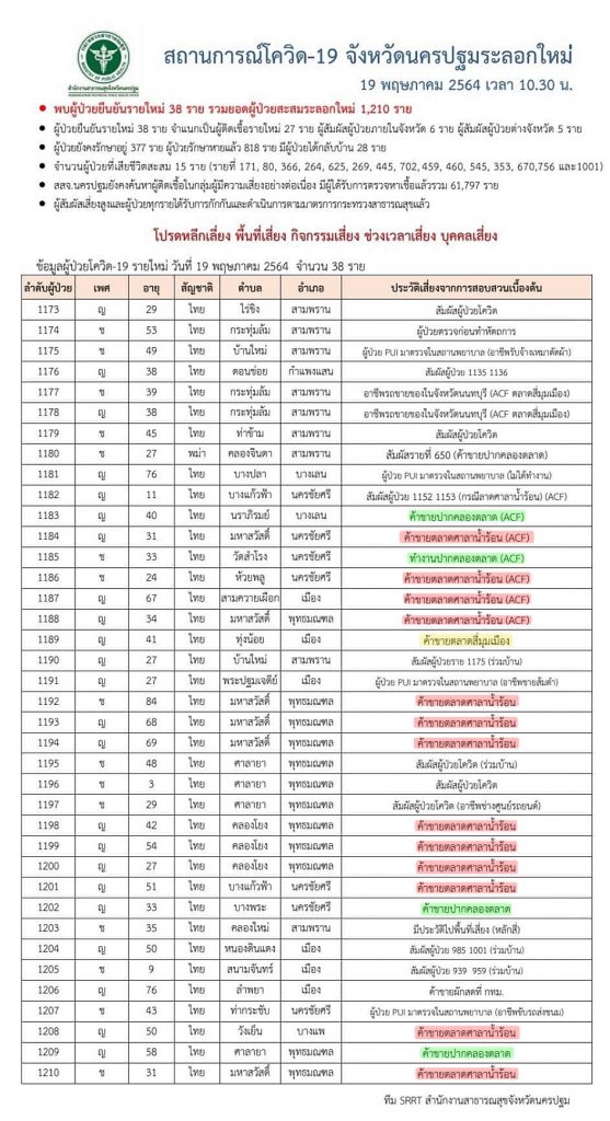 นครปฐม 19 พ.ค. – โควิดนครปฐมวันนี้ พบผู้ป่วยรายใหม่อีก 38 คน เป็นผู้ค้าในตลาดศาลาน้ำร้อนถึง 13 คน ปากคลองตลาด 4 คน พร้อมประกาศเตือนผู้ที่เคยเดินทางไปตลาดสี่มุมเมืองให้รีบไปตรวจหาเชื้อโควิดด่วน