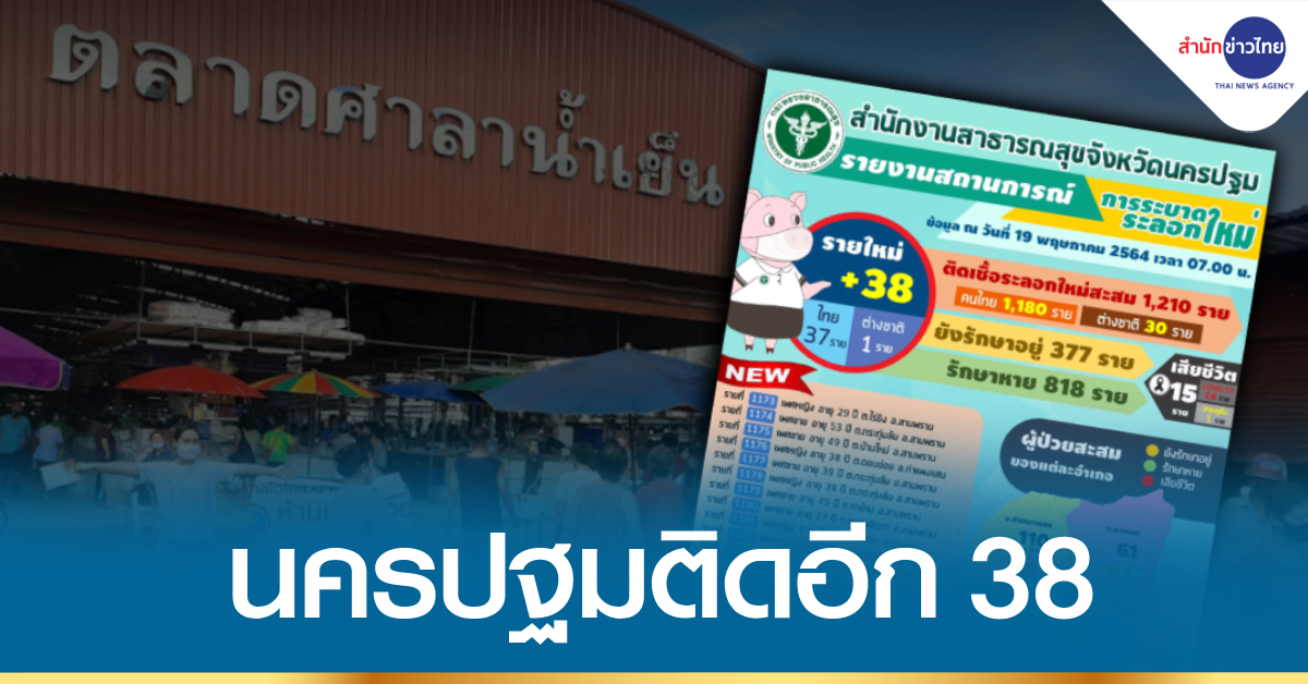 สำนักงานสาธารณสุขจังหวัดนครปฐม รายงานสถานการณ์โควิด-19 วันนี้ (19 พ.ค.) พบผู้ป่วยยืนยันรายใหม่ 38 ราย จำแนกเป็นผู้ติดเชื้อรายใหม่ 27 ราย ผู้สัมผัสผู้ป่วยภายในจังหวัด 6 ราย และผู้สัมผัสผู้ป่วยต่างจังหวัด 5 ราย รวมยอดผู้ป่วยสะสมระลอกใหม่ 1,210 ราย ยังคงรักษาอยู่ 377 ราย ผู้ป่วยรักษาหาย 818 ราย (มีผู้ป่วยได้กลับบ้านแล้ว 28 ราย) และมีผู้ป่วยเสียชีวิตสะสม 15 ราย