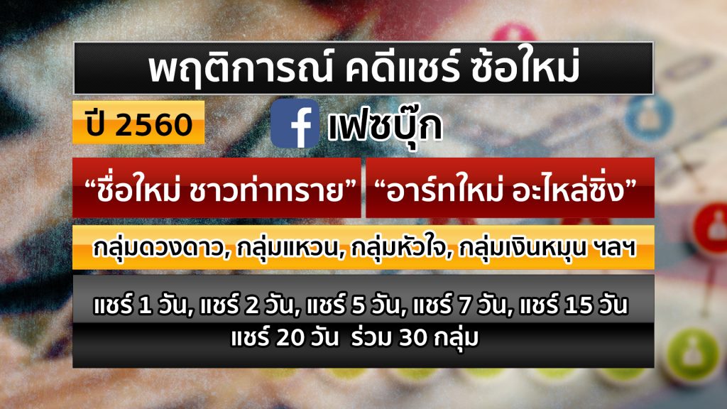 โดยพฤติการณ์ของผู้ต้องหาทั้งสองคน เริ่มตั้งแต่ปี 2560 ได้เปิดเฟซบุ๊กเล่นแชร์ ชื่อ “ใหม่ ชาวท่าทราย” และ “อาร์ทใหม่ อะไหล่ซิ่ง” ชักชวนให้บุคคลทั่วไปร่วมเล่นแชร์มีชื่อกลุ่มแชร์หลายกลุ่ม เช่น กลุ่มดวงดาว, กลุ่มแหวน, กลุ่มหัวใจ, กลุ่มเงินหมุน ฯลฯ และจะมีการเปียแชร์ ตั้งแต่ แชร์ 1 วัน, แชร์ 2 วัน, แชร์ 5 วัน, แชร์ 7 วัน, แชร์ 15 วัน และแชร์ 20 วัน มีประมาณ 30 กลุ่ม แต่ละกลุ่มจะมีผู้ร่วมเล่นแชร์ ตั้งแต่ 11 มือ สูงสุด 50 มือ วงเงินแชร์ตั้งแต่ มือละ 5,000 บาท ถึงมือละ 100,000 บาท วงเงินการเล่นเบื้องต้นประมาณ 50 ล้านบาท