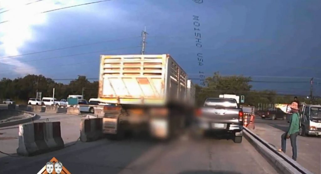 ภาพจากกล้องหน้ารถบันทึกภาพเหตุการณ์ขณะชายวัยรุ่นขี่รถจักรยานยนต์พยายามขี่แทรกกลาง ช่วงสัญญาณไฟเขียว บริเวณสามแยกไฟแดงประเวศ ถนนสายประเวศ-เทพราช หมู่1 ต.คลองประเวศ อ.บ้านโพธิ์ จ.ฉะเชิงเทรา จนถูกรถพ่วงเฉี่ยวจนรถจักรยานยนต์ล้ม และทับบริเวณแขน ลากไถลไปตามพื้นถนนได้รับบาดเจ็บสาหัส ก่อนที่รถบรรทุกพ่วงจะต่อไปทางอำเภอบางปะกง ขณะที่ผู้บาดเจ็บเป็นชายวัยรุ่น อายุประมาณ 18-25 ปี เจ้าหน้าที่เร่งปฐมพยาบาลก่อนนำส่งโรงพยาบาลพุทธโสธร