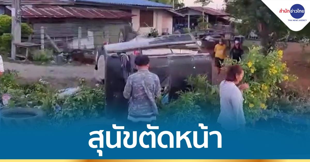 ลพบุรี 22 พ.ค.-รถรับ–ส่งคนงาน เสียหลักพลิกคว่ำ บนถนนสุรนารายณ์ จ.ลพบุรี บาดเจ็บ 11 ราย คนขับหญิงวัย 38 ปี เผยสุนัขตัดหน้า จึงหักหลบกะทันหัน