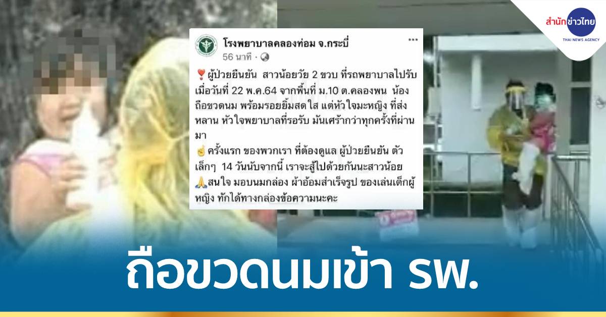 โลกออนไลน์ต่างส่งกำลังใจและแชร์ต่อเป็นจำนวนมาก หลังเพจ Facebook โรงพยาบาลคลองท่อม จังหวัดกระบี่ โพสต์ภาพความน่ารักของเด็กหญิงวัย 2 ขวบที่เป็นผู้ป่วยโควิด-19 ขณะรถพยาบาลมารับตัวไปรักษาที่โรงพยาบาลคลองท่อม เมื่อวันที่ 22 พฤษภาคม จากพื้นที่ หมู่ 10 ตำบลคลองพน พร้อมข้อความว่า