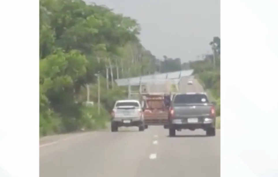 มุกดาหาร 25 พ.ค.- รถขนโครงสร้างบ้านปิดช่องทางจราจร โดยใช้รถกระบะ 2 คันปิดท้ายห้ามใครแซง จนชาวบ้านอัดคลิปโวย ถามกลับใหญ่มาจากไหน