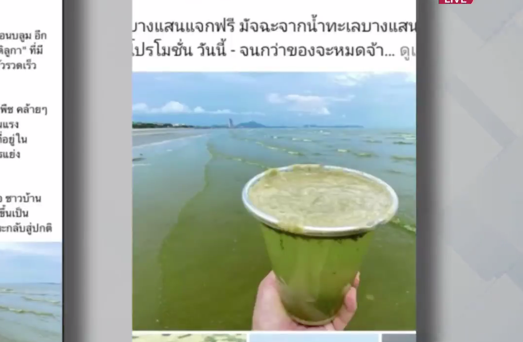 เฟซบุ๊กชื่อ ชอบจังบางแสน ได้โพสต์รูปภาพทะเลบางแสนที่มีน้ำสีเขียวเข้มมีฟอง คล้ายน้ำชาเขียว พร้อมข้อความว่า “บางแสนแจกฟรี มัจฉะจากน้ำทะเลบางแสน โปรโมชั่นวันนี้จนกว่าของจะหมดจ้า พร้อมบรรยายว่าน่าจะเป็นแพลงก์ตอนประจำฤดูฝน “น็อคติลูกา” ที่มีสาหร่ายสีเขียวอยู่ในตัว และเกิดการแบ่งตัวรวดเร็วมหาศาล จนเต็มทะเล บางแสน”