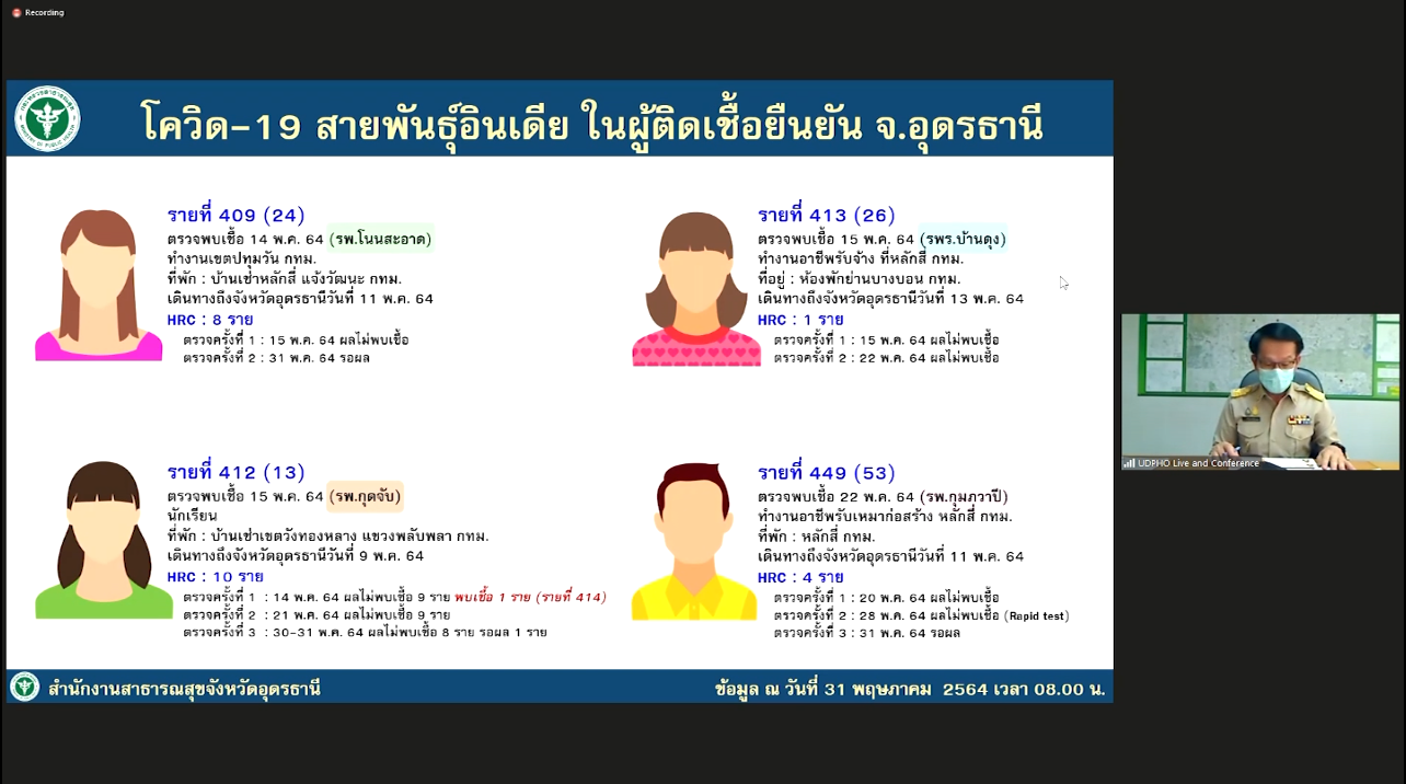 เมื่อวานนี้ (31 พ.ค.) นายสยาม ศิริมงคล ผู้ว่าราชการจังหวัดอุดรธานี พร้อมคณะ แถลงสถานการณ์โควิด-19 ผ่านระบบ Zoom ว่า พบผู้ติดเชื้อโควิด-19 เพิ่มขึ้น 2 ราย ทำให้ยอดสะสมอยู่ที่ 418 ราย เสียชีวิตเพิ่ม 1 ราย รวม 4 ราย และได้รับรายงานว่า ผู้ติดเชื้อรายเดิม 4 ราย เป็นโควิด-19 สายพันธุ์อินเดีย สำหรับผู้เสียชีวิต 1 ราย เป็นชาย อายุ 58 ปี และเป็นผู้ป่วยเบาหวาน วัณโรคเรื้อรัง และป่วยติดเตียง รักษาตัวในห้องไอซียู 21 วัน กระทั่งเสียชีวิต เนื่องจากเลือดเป็นกรด และความดันต่ำ