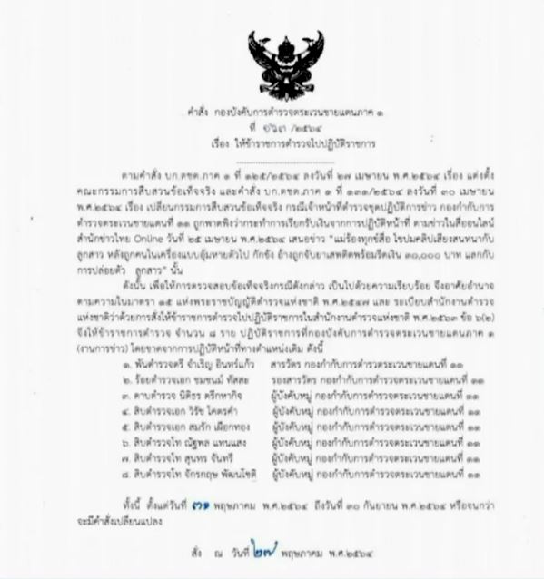 1 มิ.ย. – พล.ต.อ.วิสนุ ปราสาททองโอสถ จเรตำรวจแห่งชาติ ลงพื้นที่ จ.จันทบุรี และระยอง เร่งรัดคดีมีผู้เสียหายร้องเรียนถูก ตชด. 8 นาย ยัดข้อหายาเสพติด และเรียกรับเงินรายละ 30,000-50,000 บาท เพื่อแลกการปล่อยตัว