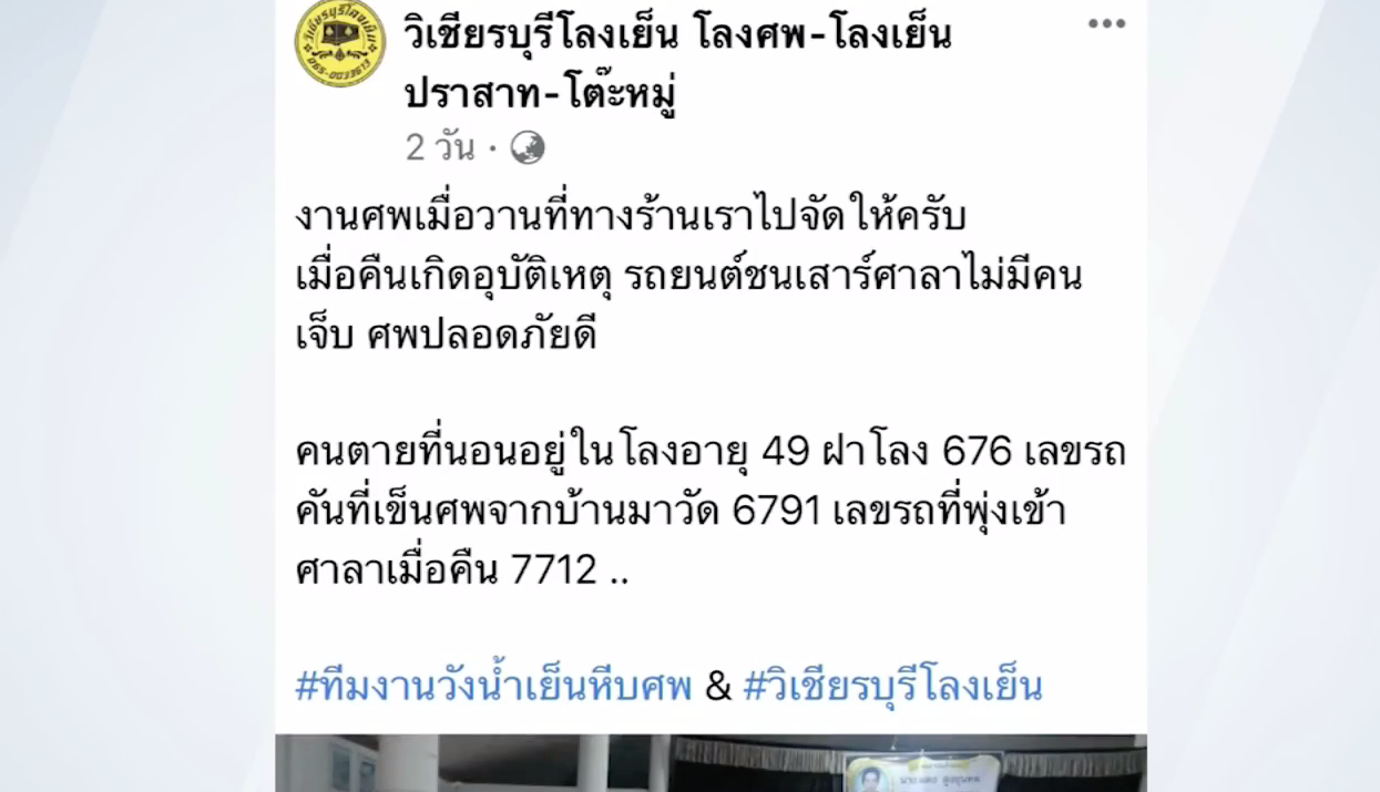 ผู้ใช้เฟซบุ๊กรายหนึ่งชื่อว่า “วิเชียรบุรีโลงเย็น โลงศพ-โลงเย็น ปราสาท-โต๊ะหมู่” โพสต์รูปภาพรถเก๋งชนเสาศาลากลางงานศพ พร้อมระบุข้อความว่า “งานศพเมื่อวานที่ทางร้านเราไปจัดให้ครับ เมื่อคืนเกิดอุบัติเหตุรถยนต์ชนเสาศาลาไม่มีคนเจ็บ ศพปลอดภัยดี คนตายที่นอนอยู่ในโลงอายุ 49 ฝาโลง 676 เลขรถคันที่เข็นศพจากบ้านมาวัด 6791 เลขรถที่พุ่งเข้าศาลาเมื่อคืน 7712 #ทีมงานวังน้ำเย็นหีบศพ & #วิเชียรบุรีโลงเย็น”