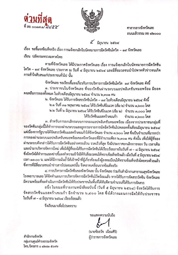 หลังจากเมื่อวานนี้ (4 มิ.ย.) จ.เลย ออกประกาศเลื่อนการฉีดวัคซีนโควิด-19 ในวันที่ 7 มิถุนายนออกไป และวันนี้นายชัยธวัช เนียมศิริ ผู้ว่าราชการจังหวัดเลย ได้ออกหนังสือด่วนที่สุดชี้แจงข้อเท็จจริง เรื่องการยกเลิกใบนัดหมายการฉีดวัคซีนโควิด-19 และเดินหน้าการฉีดวัคซีนตามปกติ หลังได้รับการจัดสรรวัคซีนต่อเนื่อง