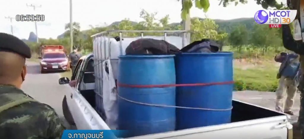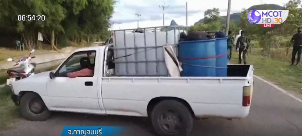 ช่วงเย็นวานนี้ (6 เม.ย.) นายอำเภอไทรโยค พร้อมตำรวจ สภ.ไทรโยค จ.กาญจนบุรี และหน่วยเฉพาะกิจลาดหญ้า กองกำลังสุรสีห์ จับกุมนายประสิทธิ์ อายุ 62 ปี พร้อมแรงงานต่างด้าวชาวเมียนมา 11 คน เป็นชาย 6 คน หญิง 5 คน พร้อมรถกระบะโตโยต้าตอนเดียว สีขาว ทะเบียน ผอ4122 กรุงเทพมหานคร หลังนำแรงงานกลุ่มนี้ซุกซ่อนมากับถังพลาสติกขนาด 1,000 ลิตร ที่อยู่ท้ายกระบะ อัดแน่นกัน 5 คน และถังขนาด 200 ลิตร 2 ถัง ถังละ 2 คน โดยมีกระเป๋าสัมภาระปิดทับตัวแรงงานเอาไว้เพื่อตบตาเจ้าหน้าที่ ท่ามกลางอากาศร้อนอบอ้าว นอกจากนี้ยังมีแรงงานนั่งมากับนายประสิทธิ์อีก 2 คน ที่หน้ารถ