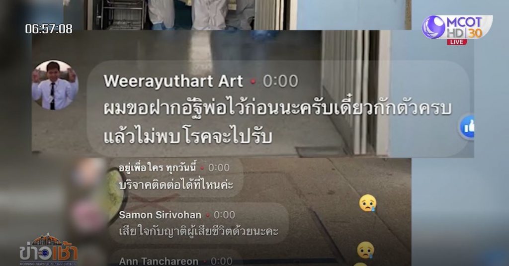 ด้านนายณัฏฤทธิ์ หนุนพระเดช แอดมินเพจเรารักแปดริ้ว เปิดเผยว่า ขณะที่กำลังไลฟ์บริเวณหน้าห้องสุขคติ โรงพยาบาลพุทธโสธร อยู่นั้น มีผู้ใช้เฟซบุ๊กชื่อ “Weerayuthart ArtW” ได้แสดงความคิดเห็นว่า “ผมขอฝากอัฐิพ่อไว้ก่อนนะครับ เดี๋ยวกักตัวครบแล้ว ไม่พบโรคจะไปรับ” และ “ผมฝากเป็นธุระแทนครอบครัวผมด้วยนะครับ” หลังจากการไลฟ์จบ ได้ติดต่อสอบถามกลับไปจึงทราบว่าเป็นลูกชายของผู้เสียชีวิต ขณะนี้ทั้งครอบครัวถูกกักตัวอยู่ในโรงพยาบาลสนาม ไม่สามารถเดินทางมาประกอบพิธีได้ จึงได้ดูผ่านทางไลฟ์เพื่อร่วมส่งพ่อเป็นครั้งสุดท้าย.-สำนักข่าวไทย